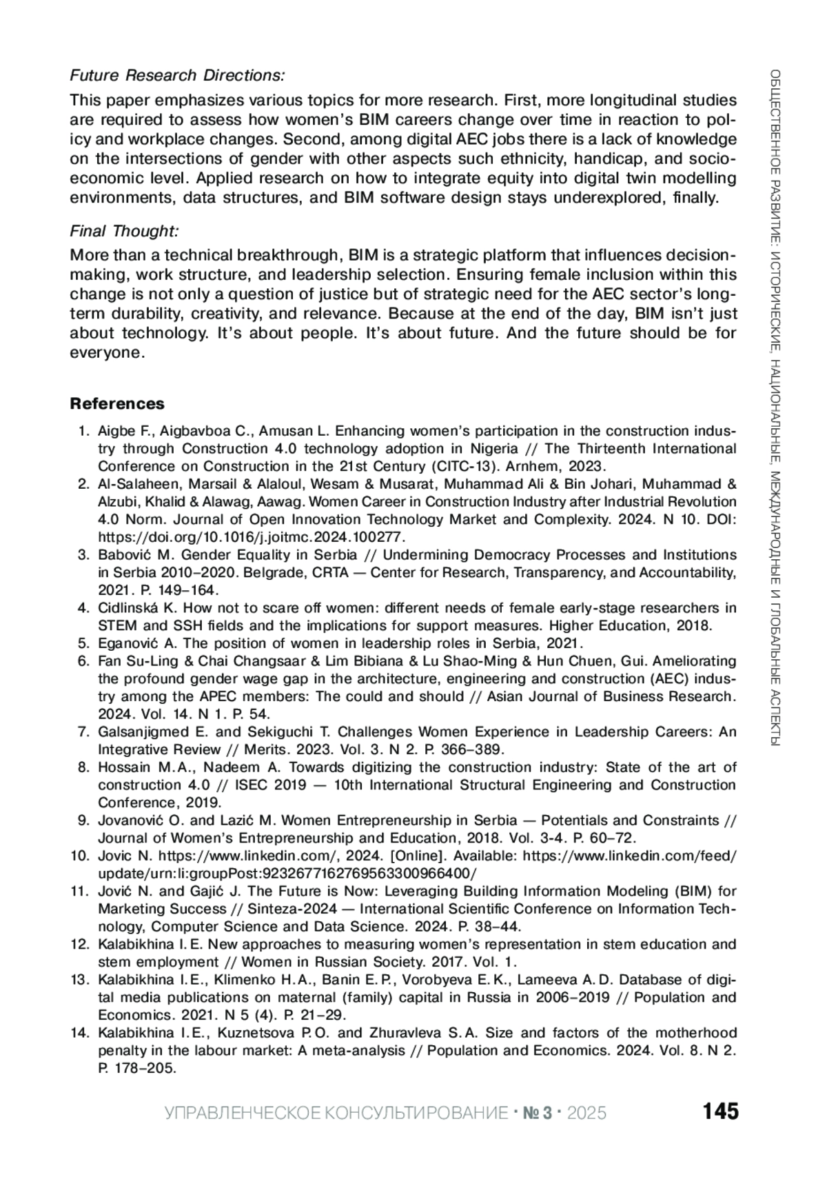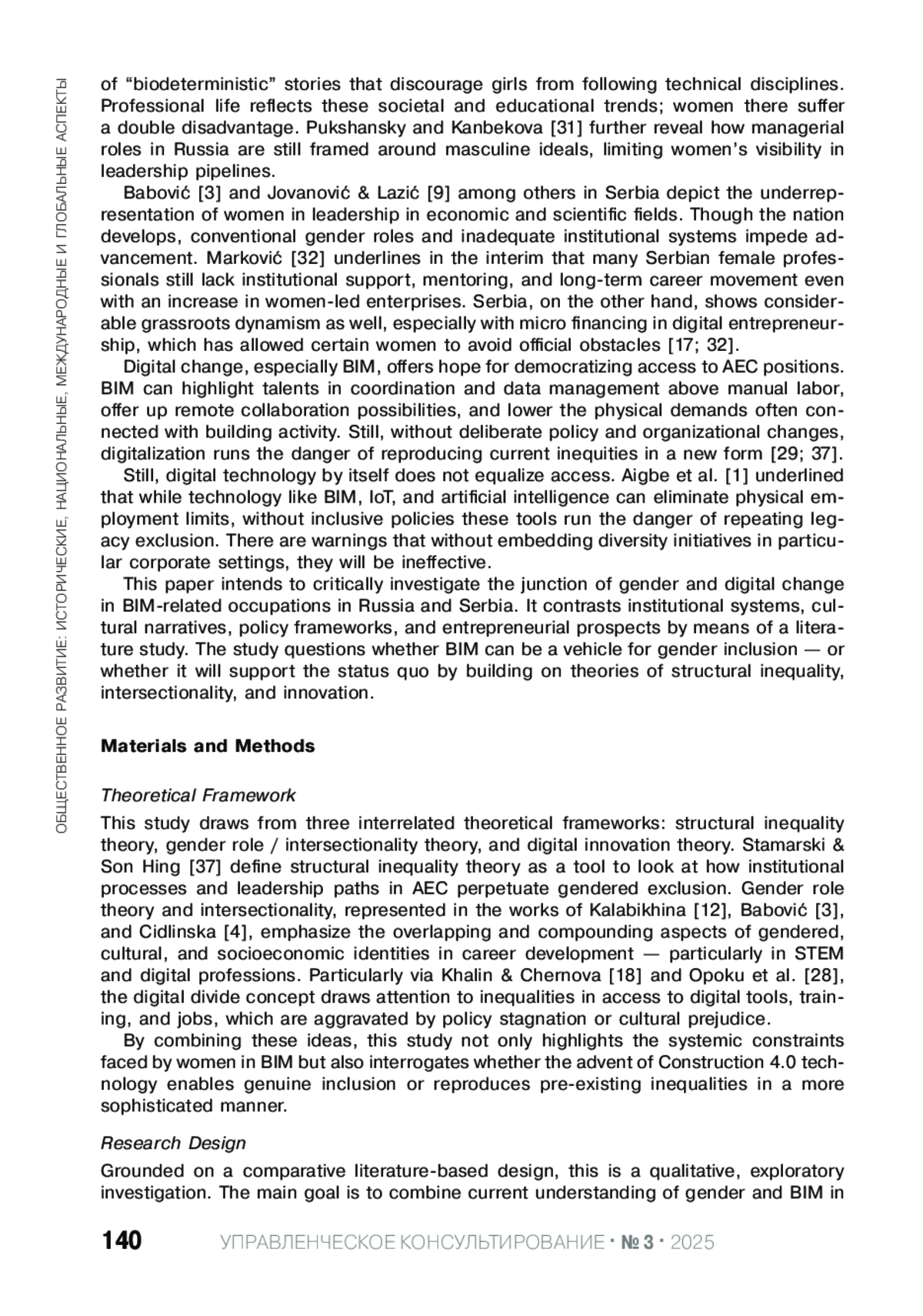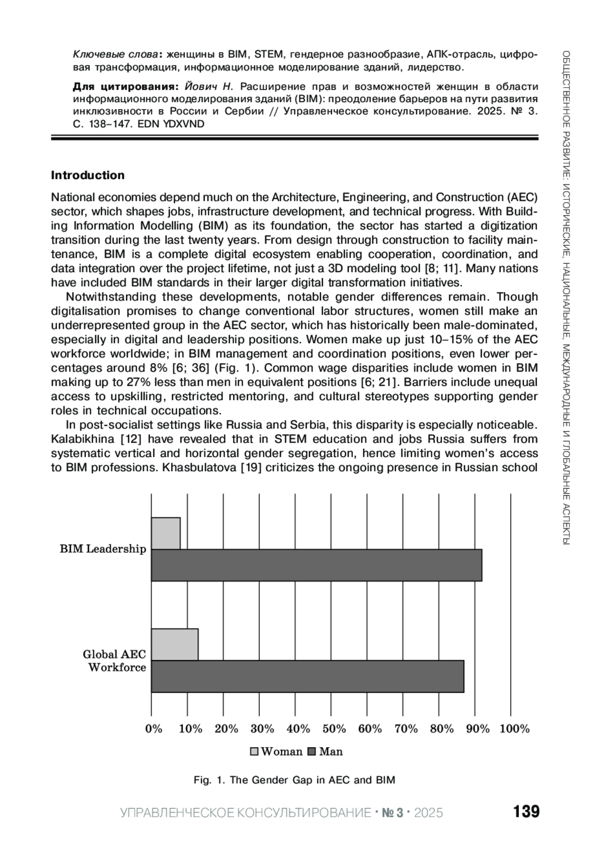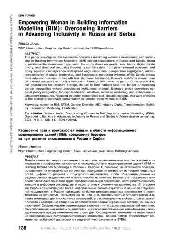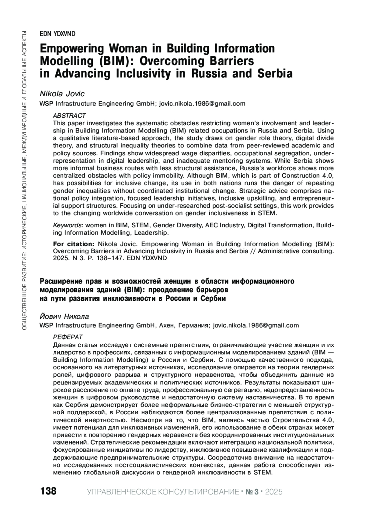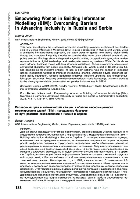 Данная статья исследует системные препятствия, ограничивающие участие женщин и их лидерство в профессиях, связанных с информационным моделированием зданий (BIM - Building Information Modelling) в России и Сербии. С помощью качественного подхода, основанного на литературных источниках, исследование опирается на теории гендерных ролей, цифрового разрыва и структурного неравенства, чтобы объединить данные из рецензируемых академических и политических источников. Результаты показывают широкое расслоение по оплате труда, профессиональную сегрегацию, недопредставленность женщин в цифровом руководстве и недостаточную систему наставничества. В то время как Сербия демонстрирует более неформальные бизнес-стратегии с меньшей структурной поддержкой, в России наблюдаются более централизованные препятствия с политической инертностью. Несмотря на то, что BIM, являясь частью Строительства 4.0, имеет потенциал для инклюзивных изменений, его использование в обеих странах может привести к повторению гендерных неравенств без координированных институциональных изменений. Стратегические рекомендации включают интеграцию национальной политики, фокусированные инициативы по лидерству, инклюзивное повышение квалификации и поддерживающие предпринимательские структуры. Сосредоточив внимание на недостаточно исследованных постсоциалистических контекстах, данная работа способствует изменению глобальной дискуссии о гендерной инклюзивности в STEM.