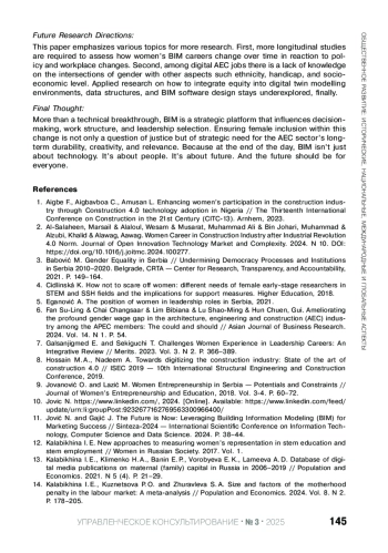 1. Aigbe F., Aigbavboa C., Amusan L. Enhancing women’s participation in the construction industry through Construction 4.0 technology adoption in Nigeria // The Thirteenth International Conference on Construction in the 21st Century (CITC-13). Arnhem, 2023.