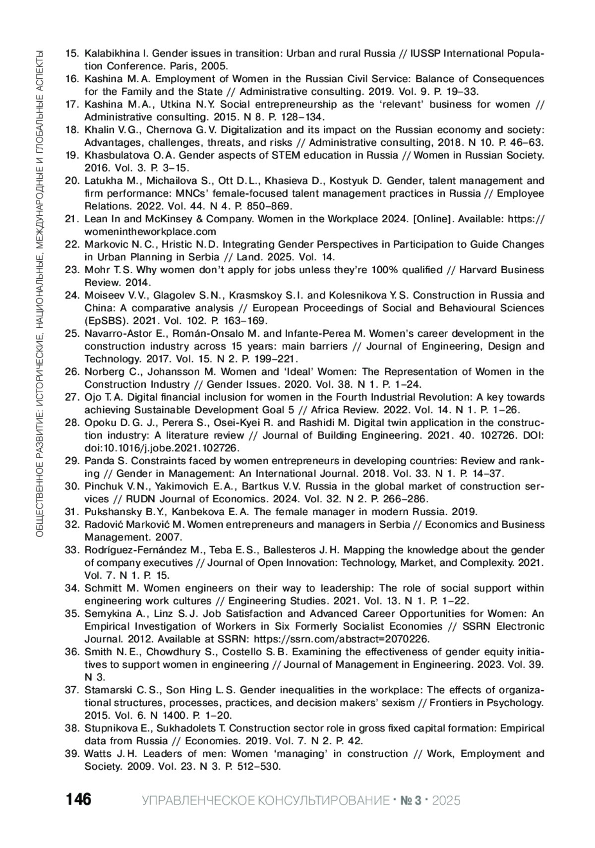 25. Navarro-Astor E., Román-Onsalo M. and Infante-Perea M. Women’s career development in the construction industry across 15 years: main barriers // Journal of Engineering, Design and Technology. 2017. Vol. 15. N 2. P. 199-221.