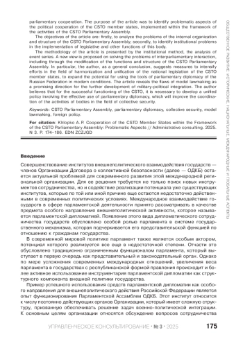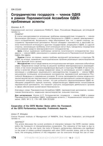 The article discusses the current problems of interaction between the CSTO member states within the framework of interparliamentary cooperation. The relevance of the topic is due to the fact that, on the one hand, the tools of Russia’s parliamentary diplomacy are significant on the scale of military-political integration with other CSTO member states, and on the other hand, the emerging problems of this integration can be overcome through the use of inter parliamentary cooperation. The purpose of the article was to identify problematic aspects of the political cooperation of the CSTO member states, implemented within the framework of the activities of the CSTO Parliamentary Assembly. The objectives of the article are: firstly, to analyze the problems of the internal organization and structure of the CSTO Parliamentary Assembly; secondly, to identify institutional problems in the implementation of legislative and other functions of this body. The methodology of the article is presented by the institutional method, the analysis of event series. A new view is proposed on solving the problems of interparliamentary interaction, including through the modification of the functions and structure of the CSTO Parliamentary Assembly. In particular, the author, as a general conclusion, suggests measures to intensify efforts in the field of harmonization and unification of the national legislation of the CSTO member states, to expand the potential for using the tools of parliamentary diplomacy of the Russian Federation in modern conditions. The article reveals the flaws of model lawmaking as a promising direction for the further development of military-political integration. The author believes that for the successful functioning of the CSTO, it is necessary to develop a unified policy involving the effective use of parliamentary diplomacy, which will improve the coordination of the activities of bodies in the field of collective security.