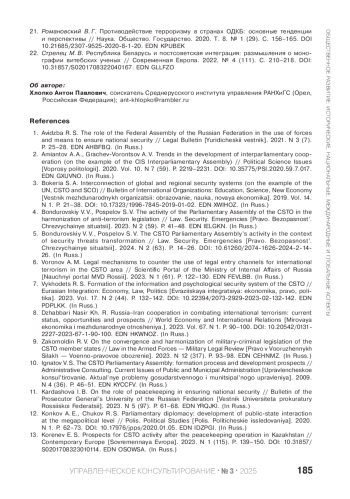 6. Воронов А. М. Организационно-правовой механизм воспрепятствования использованию легальных каналов проникновения международного терроризма на территорию ОДКБ // Научный портал МВД России. 2023. № 1 (61). С. 122-130. EDN: FEVLBB