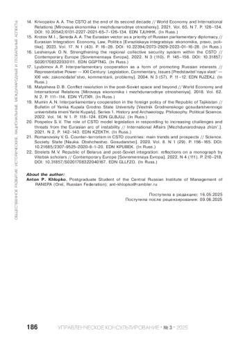 7. Выходец Р. С. Формирование системы информационно-психологической безопасности Организации Договора о коллективной безопасности // Евразийская интеграция: экономика, право, политика. 2023. Т. 17, № 2 (44). С. 132-142. DOI: 10.22394/2073-2929-2023-02-132-142 EDN: PDPLKK