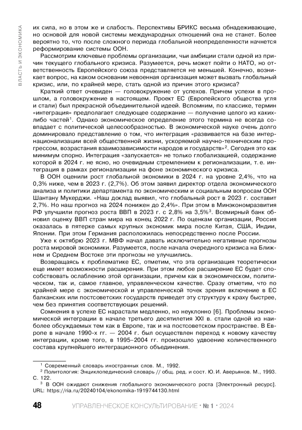 Ключевые фразы: мировая политика, глобальная экономика, глобализация, регионализация, Европейский Союз, ООН, евразийская интеграция, КАЧЕСТВО УПРАВЛЕНИЯ
