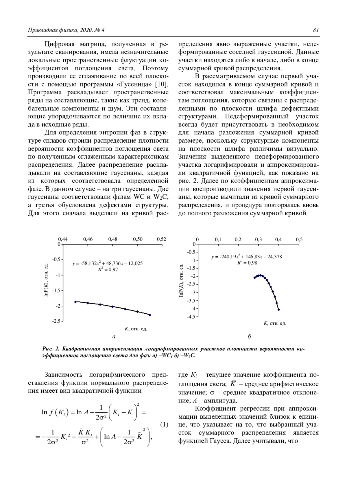 Расчет энтропии как одной из основных термодинамических характеристик позволяет изучать условия равновесия системы, в частности, исследовать процессы контактного взаимодействия при пропитке композиционных материалов. В работе предложен метод вычисления энтропии фаз в сплавах с использованием сканирования их оцифрованных фотоизображений с помощью программы TLC_Manager_4_0_15VA и дальнейшей статистической обработки. При сканировании формировалась матрица значений, выраженных через коэффициенты поглощения света от поверхности шлифа сплава. Статистические данные многокомпонентной структуры разделяли на отдельные гауссианы, соответствующие определенным фазам. При этом аппроксимировали квадратичной функцией в логарифмическом представлении участки кривой суммарного распределения плотности вероятности коэффициентов поглощения света. Параметры гауссиан вычисляли исходя из того, что зависимость логарифмического представления функции нормального распределения имеет вид квадратичной функции. Это позволило вычислить среднеквадратичные отклонения гауссиан, необходимые для расчета энтропии фаз. Полученные значения энтропии фаз карбидов вольфрама WC и W2C удовлетворительно совпадают со справочными данными.
