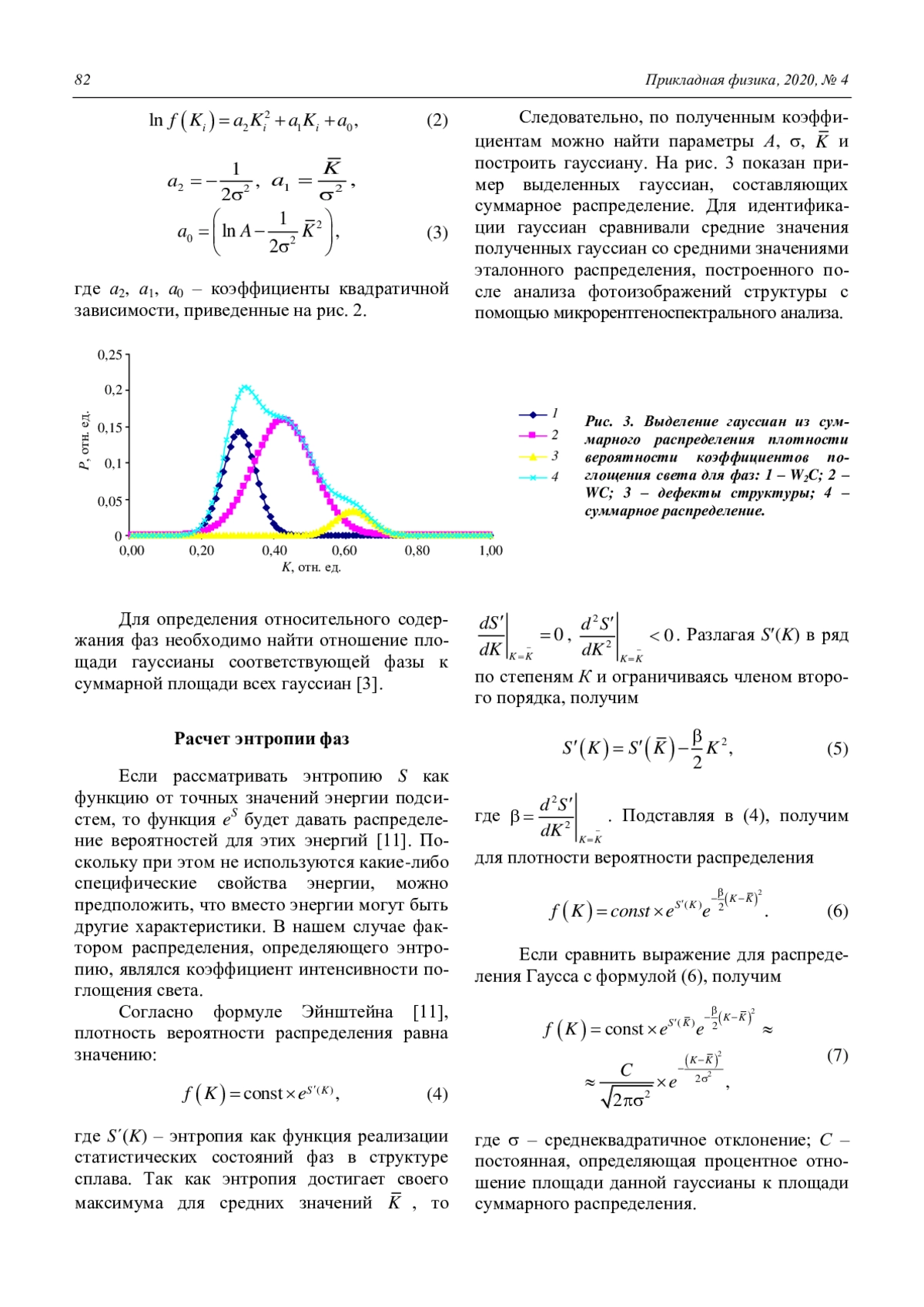 Элементы полученной при сканировании цифровой матрицы значений коэффициентов поглощения света отображают пространственную конфигурацию фаз в сплавах. Разделение суммарного распределения плотности вероятности коэффициентов поглощения на отдельные гауссианы, соответствующие фазам, позволяет вычислить для каждой фазы среднеквадратичное отклонение. Используя найденные среднеквадратичные отклонения, вычисляли энтропию соответствующих фаз, причем фактором распределения, определяющим энтропию в формуле Эйнштейна, являлся коэффициент поглощения света.