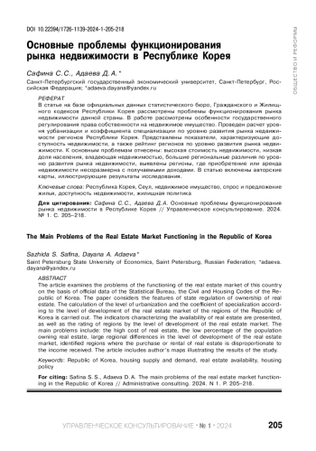 В статье на базе официальных данных статистического бюро, Гражданского и Жилищного кодексов Республики Корея рассмотрены проблемы функционирования рынка недвижимости данной страны. В работе рассмотрены особенности государственного регулирования права собственности на недвижимое имущество. Проведен расчет уровня урбанизации и коэффициента специализации по уровню развития рынка недвижимости регионов Республики Корея. Представлены показатели, характеризующие доступность недвижимости, а также рейтинг регионов по уровню развития рынка недвижимости. К основным проблемам отнесены: высокая стоимость недвижимости, низкая доля населения, владеющая недвижимостью, большие региональные различия по уровню развития рынка недвижимости, выявлены регионы, где приобретение или аренда недвижимости несоразмерна с получаемыми доходами. В статью включены авторские карты, иллюстрирующие результаты исследования.