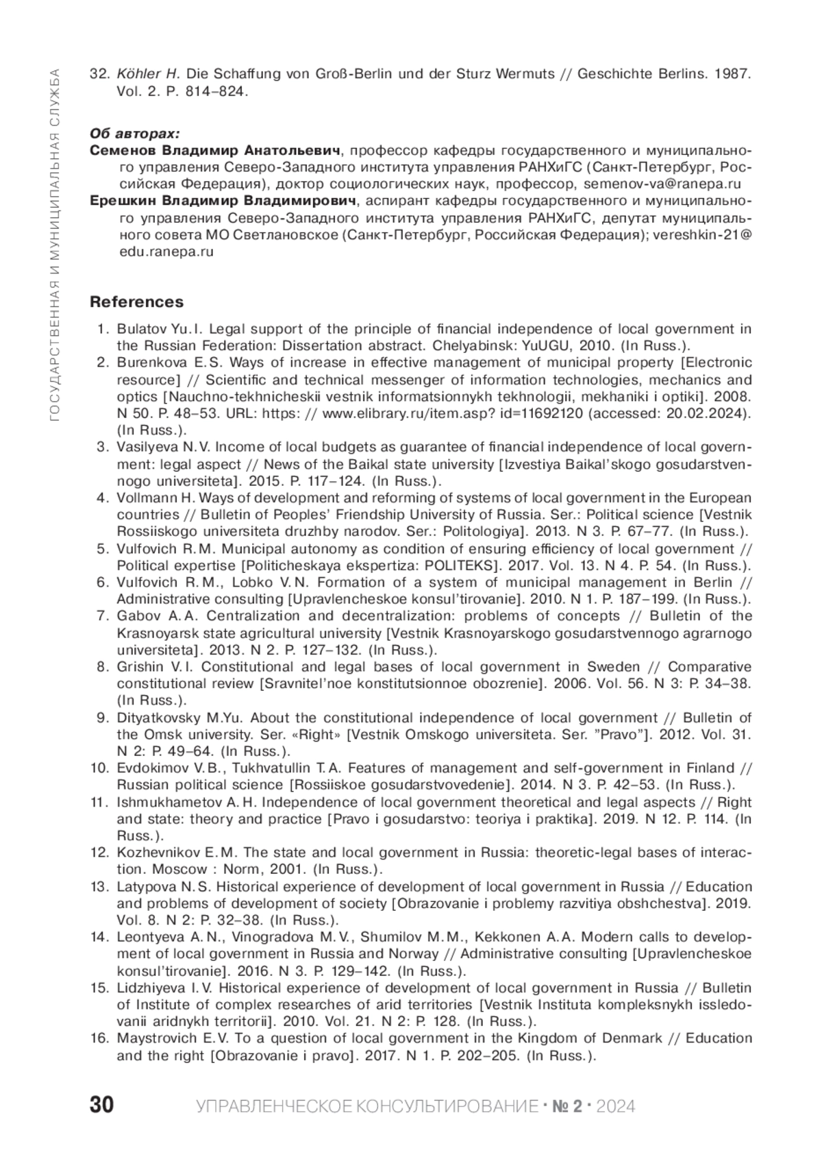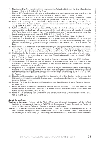 In modern history, public authority has expanded its political and legal interpretation. By an amendment to the Constitution of the Russian Federation from 2020 on improving the regulation of certain issues of the organization and functioning of public authority, the bodies of local self-government were included among the bodies of public authority. Based on Article 132 of the RF Constitution, LSG bodies entered the unified system of public authority in the Russian Federation and began to cooperate with state authorities for the most effective resolution of tasks in the interests of the population residing in the respective territory. The European Charter on Local Self-Governance defines and the Constitution of the Russian Federation enshrines the historical and legal basis for the establishment of local self-governance in a particular territory - its autonomy. The cultural and historical peculiarities of the inhabitants of these territories must be taken into account. The people of St Petersburg exercise their constitutional right to exercise power through local government. It has its own cultural code, which is expressed in special history, local customs and traditions, a multinational population, and a multitude of confessions. Local self-government is represented by 111 inner-city municipalities and 1 Council of Municipalities. Local government is regulated by the law on organization of local government in St Petersburg. The degree to which the residents’ right to power, and thus political stability in the region, depends on the quality of the local government’s performance of its powers. The 2019 municipal elections changed the quality of the representative bodies by supplementing them with independent, non-systemic deputies. This circumstance allowed for a different perspective on the specifics of local government and the functioning of LSG bodies. In the opinion of the authors, this renewal is not so much the desire of the population of the metropolis to change the composition of the representative bodies, but rather the consequence of a consistent government policy of centralizing local self-governance. After the incorporation of local self-governance into the system of public authorities and the artificial subordination of its legal nature to the needs of state power, the managerial principle of federal megacities of urban unity became the main reason, exploiting which, as a screen, the state power consistently deprives LSG bodies of independence, reducing the financial basis, the number of issues of local significance, and traditionally local functionality. The article attempts to determine the level of autonomy of LSG bodies of St. Petersburg, the direction of the vector of normative-legal regulation of state power in relation to the constitutional institution, to analyze the results of the findings, to draw conclusions and to assess the level of autonomy of local self-government in the political aspect, as well as the possible consequences of such state policy on the ground. The aim of this article is to provide scientific substantiation of necessity of certain decisions of state power bodies with the aim of preventing governmentalization of local self-government in St. Petersburg, to offer concrete measures for decision-making by state power bodies.