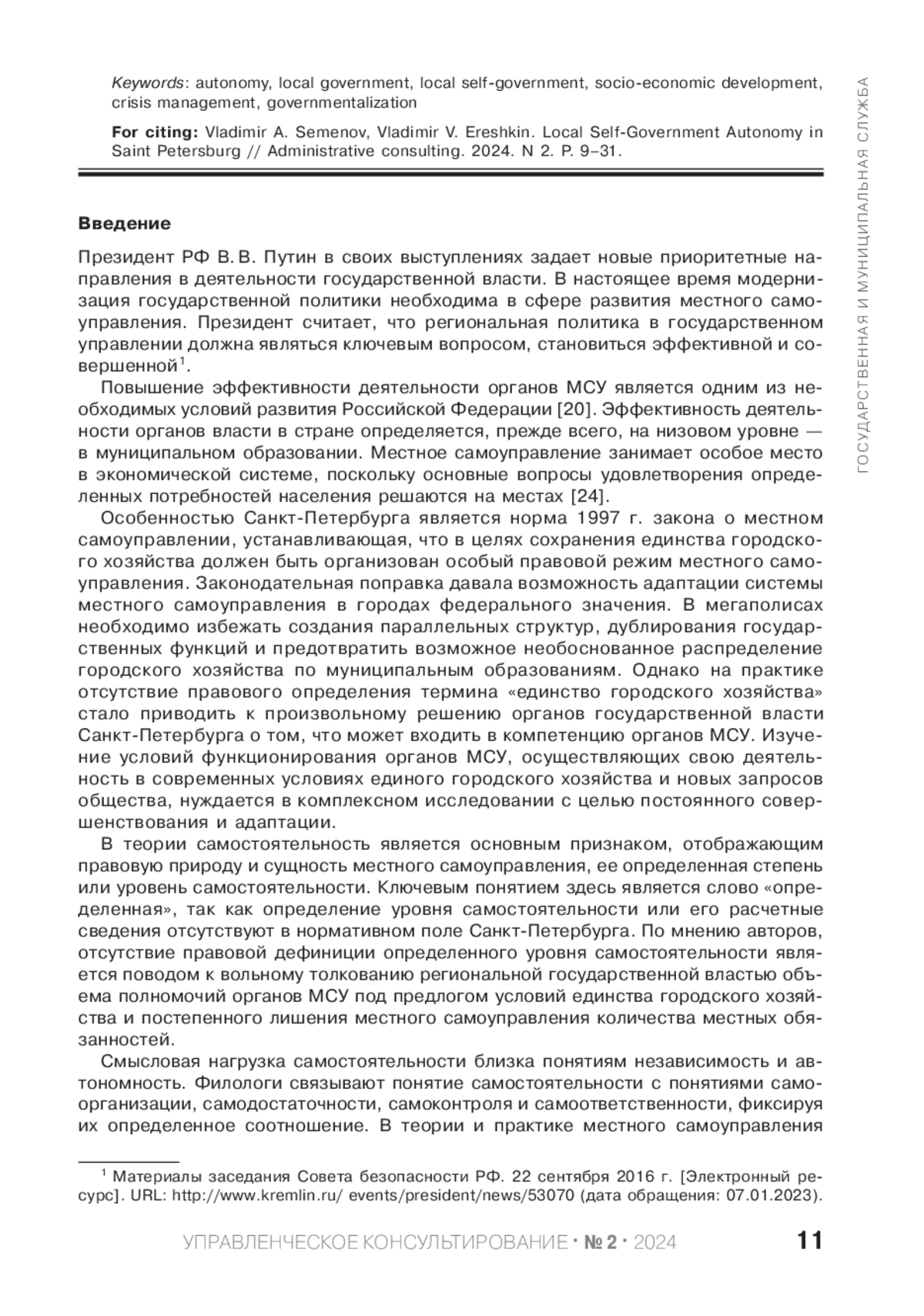 В новейшей истории публичная власть расширила свое политологическое и правовое толкование. Поправкой к Конституции РФ от 2020 г. о совершенствовании регулирования отдельных вопросов организации и функционирования публичной власти, органы местного самоуправления (далее - органы МСУ) были отнесены к органам публичной власти. Согласно ст. 132 Конституции РФ органы МСУ вошли в единую систему публичной власти в Российской Федерации и стали осуществлять взаимодействие совместно с органами государственной власти для наиболее эффективного решения задач в интересах населения, проживающего на соответствующей территории. Европейской хартией о местном самоуправлении определена, а Конституцией России закреплена историческая и правовая основа установления местного самоуправления на определенной территории - его самостоятельность. При этом должны учитываться культурные и исторические особенности жителей, проживающих на данных территориях. Население Санкт-Петербурга через местное самоуправление реализует конституционное право на осуществление власти. Оно обладает своим культурным кодом, который выражается в особенной истории, местных обычаях и традициях, многонациональным населением, множестве конфессий. Местное самоуправление представлено 111 внутригородскими муниципальными образованиями (далее - ВМО) и 1 Советом муниципальных образований. Регулирование деятельности местного самоуправления осуществляется законом об организации местного самоуправления в Санкт-Петербурге. От качества исполнения полномочий местным самоуправлением зависит степень реализации права жителей на власть, а значит, и на политическую стабильность в регионе. Муниципальные выборы 2019 г. изменили качественные составы представительных органов, дополнив их самостоятельными несистемными депутатами. Данное обстоятельство позволило иначе взглянуть на особенности деятельности местного самоуправления, функционирования органов МСУ. По мнению авторов, такое обновление является не столько желанием населения мегаполиса сменить составы представительных органов, сколько следствием последовательной государственной политики по сокращению полномочий органов МСУ. После встраивания местного самоуправления в систему органов публичной власти, городская государственная власть в целях установления эффективного взаимодействия не осуществляет нормативно-правовое совершенствование межинституционных отношений, а консолидирует экономические механизмы решения местных вопросов, что ведет к сокращению самостоятельности органов МСУ. В статье сделана попытка определить уровень самостоятельности органов МСУ Санкт-Петербурга, направление вектора нормативно-правового регулирования государственной власти в отношении конституционного института, подвергнуть анализу результаты полученных материалов, сделать выводы и дать оценку уровню самостоятельности местного самоуправления в политологическом аспекте, а также возможным последствиям подобной государственной политики на местах. Целью настоящей статьи является научное обоснование необходимости принятия определенных решений органами государственной власти с целью недопущения уменьшения самостоятельности местного самоуправления в Санкт-Петербурге, а также увеличения относительной автономи