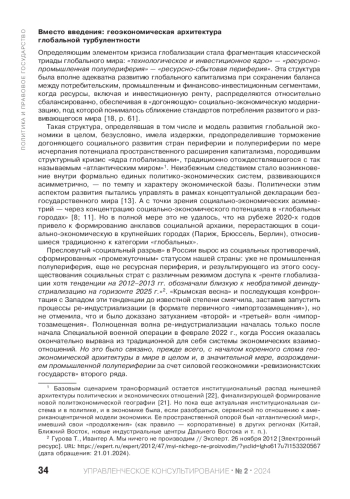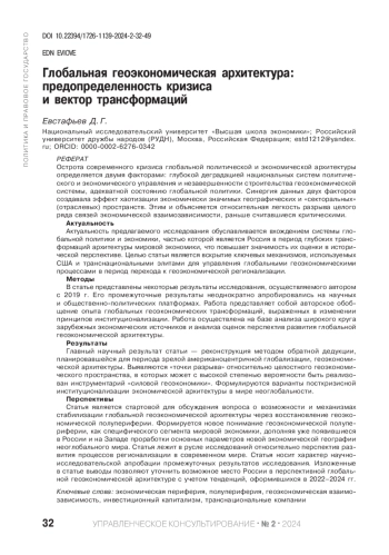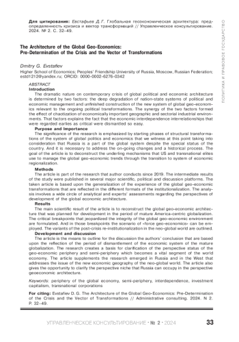 IntroductionThe dramatic nature on contemporary crisis of global political and economic architecture is determined by two factors: the deep degradation of nation-state systems of political and economic management and unfinished construction of the new system of global geo-economics relevant to the ongoing political transformations. The synergy of the two factors formed the effect of chaotization of economically important geographic and sectorial industrial environments. That factors explains the fact that the economic interdependence interrelationships that were regarded earlies as critical were dismantled so easy. Purpose and importanceThe significance of the research is emphasized by starting phases of structural transformations of the system of global politics and economics that we witness at this point taking into consideration that Russia is a part of the global system despite the special status of the country. And it is necessary to address the on-going changes and a historical process. The goal of the article is to deconstruct the underling mechanisms that US and transnational elites use to manage the global geo-economic trends through the transition to system of economic regionalization. MethodsThe article is part of the research that author conducts since 2019. The intermediate results of the study were published in several major scientific, political and discussion platforms. The taken article is based upon the generalization of the experience of the global geo-economic transformations that are reflected in the different formats of the institutionalization. The analysis involves a wide circle of analytical and experts’ assessments regarding the perspectives of development of the global economic architecture. ResultsThe main scientific result of the article is to reconstruct the global geo-economic architecture that was planned for development in the period of mature America-centric globalization. The critical breakpoints that jeopardized the integrity of the global geo-economic environment are formulated. And in those breakpoints the scenario of «force geo-economics» can be employed. The variants of the post-crisis re-institutionalization in the neo-global world are outlined. Development and discussionThe article is the means to outline for the discussion the authors’ conclusion that are based upon the reflection of the period of dismantlement of the economic system of the mature globalization. The research creates a basis for clarification of the perspective status of the geo-economic periphery and semi-periphery which becomes a vital segment of the world economy. The article supplements the research emerged in Russia and in the West that addresses the issue of the new economic geography of the neo-global world. The article also gives the opportunity to clarify the perspective niche that Russia can occupy in the perspective geoeconomic architecture.