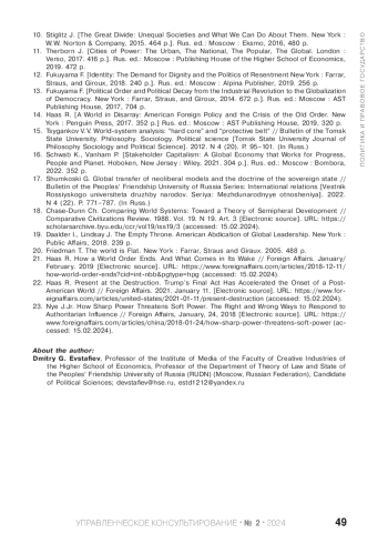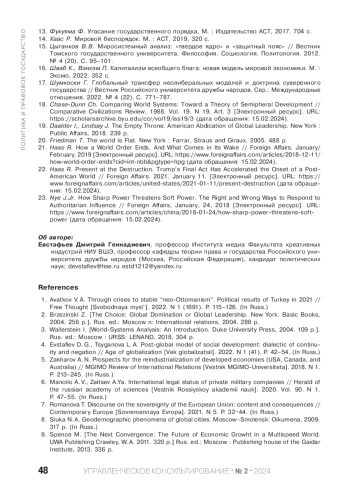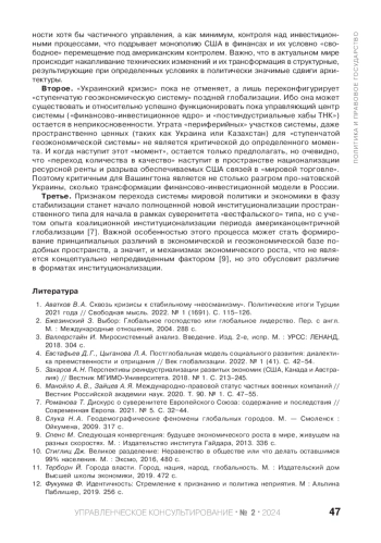 4. Евстафьев Д. Г., Цыганова Л. А. Постглобальная модель социального развития: диалектика преемственности и отрицания // Век глобализации. 2022. № 1 (41). С. 42-54. EDN: GKMRKE