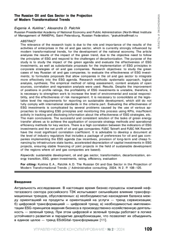 Актуальность темы исследования обусловлена ролью и значением результатов деятельности предприятий нефтегазового сектора, испытывающего в настоящее время сильное влияние современных трансформационных трендов, для целей развития национальной экономики. В статье анализируются результаты воздействия зеленого тренда, обусловленного объективной необходимостью следования принципам ESG и отвечать на вызовы декарбонизации. Целью исследования является изучение влияния зеленой повестки и оценка эффективности ESG-инвестиций, а также обоснование предложений по реализации принципов ESG в корпоративных стратегиях нефтегазовых компаний. Задачи исследования: изучить зеленые кейсы ключевых российских нефтегазовых компаний; выполнить оценку эффективности ESG-инвестиций; сформулировать предложения, позволяющие компаниям нефтегазового сектора более эффективно встраиваться в ESG-повестку. Методы исследования: системный подход, логический анализ, синтез; применялись эмпирический метод рейтинговой оценки, контент-анализ открытых источников, корреляционно-регрессионный анализ. Результаты. Несмотря на улучшение позиций в профильных рейтингах, рентабельность ESG-инвестирования нестабильна, поэтому необходимо усиление работы по повышению уровня экологической и социальной ответственности, эффективности управления рисками. Необходимо закрепить на законодательном уровне требования к составлению отчетности по устойчивому развитию, которые пока еще не полностью соответствуют международным стандартам в критериальной части. Оценку эффективности ESG-инвестиций затрудняет наличие ряда проблем, обусловленных использованием различных подходов к интеграции принципов ESG и мониторингу этого процесса с использованием KPI, недостаточной активностью в отслеживании и раскрытии информации об эффективности ESG-стратегий и др. Основные выводы. Успешное и последовательное решение задач зеленого энергоперехода позволяет достигнуть применения методов корпоративной стратегии и методов операционной эффективности по ключевым векторам. Между показателями ESG-инвестиций и чистой прибыли нефтегазовых компаний существует высокая корреляция; наиболее значимый коэффициент корреляции у ПАО «Татнефть» и ПАО «НК Роснефть». Целесообразна разработка на уровне отраслевых регуляторов документа, включающего пакет преференций для нефтегазовых компаний, реализующих ESG-повестку (налоговые льготы, предоставление долгосрочного и дешевого финансирования инфраструктурными госбанками, ускоренная амортизация капитальных вложений в ESG-проекты, обеспечение стабильного финансирования совместных проектов в сфере устойчивого развития регионов базирования нефтегазовых компаний).