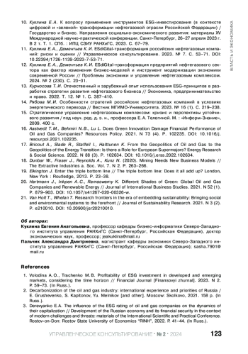 10. Куклина Е. А. К вопросу применения инструментов ESG-инвестирования (в контексте цифровой и “зеленой” трансформации нефтегазовой отрасли Российской Федерации) / Государство и бизнес. Направления социально-экономического развития: материалы XV Международной научно-практической конференции. Санкт-Петербург, 26-27 апреля 2023 г. В 2 т. Т. 1. СПб.: ИПЦ СЗИУ РАНХиГС, 2023. С. 67-79. EDN: LBXIHH