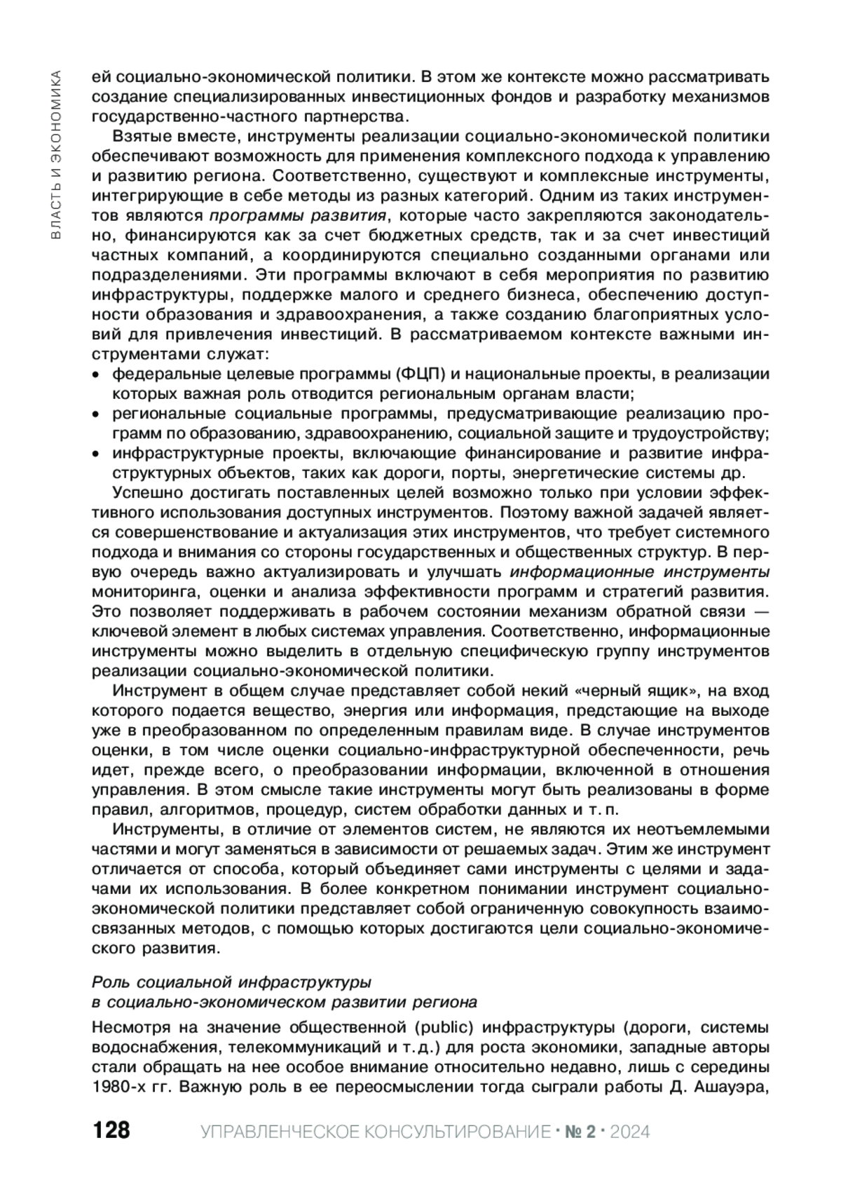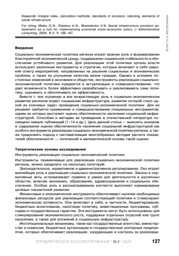 Социально-экономическая политика региона играет важную роль в формировании благоприятной экономической среды, поддержании социальной стабильности и обеспечении устойчивого развития. Для реализации этой политики органы власти используют различные инструменты и стратегии, которые включают в себя широкий спектр мероприятий, направленных на решение социальных и экономических проблем, а также на улучшение качества жизни граждан. Однако в условиях постоянных изменений в экономике и обществе, инструменты реализации социальноэкономической политики нуждаются в актуализации и совершенствовании, что дает возможность более эффективно разрабатывать и реализовывать саму политику, оценивать и обеспечивать ее эффективность
