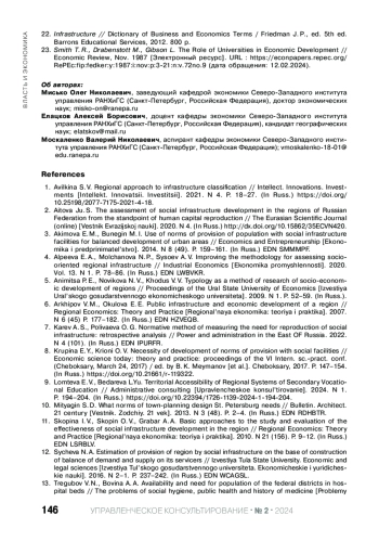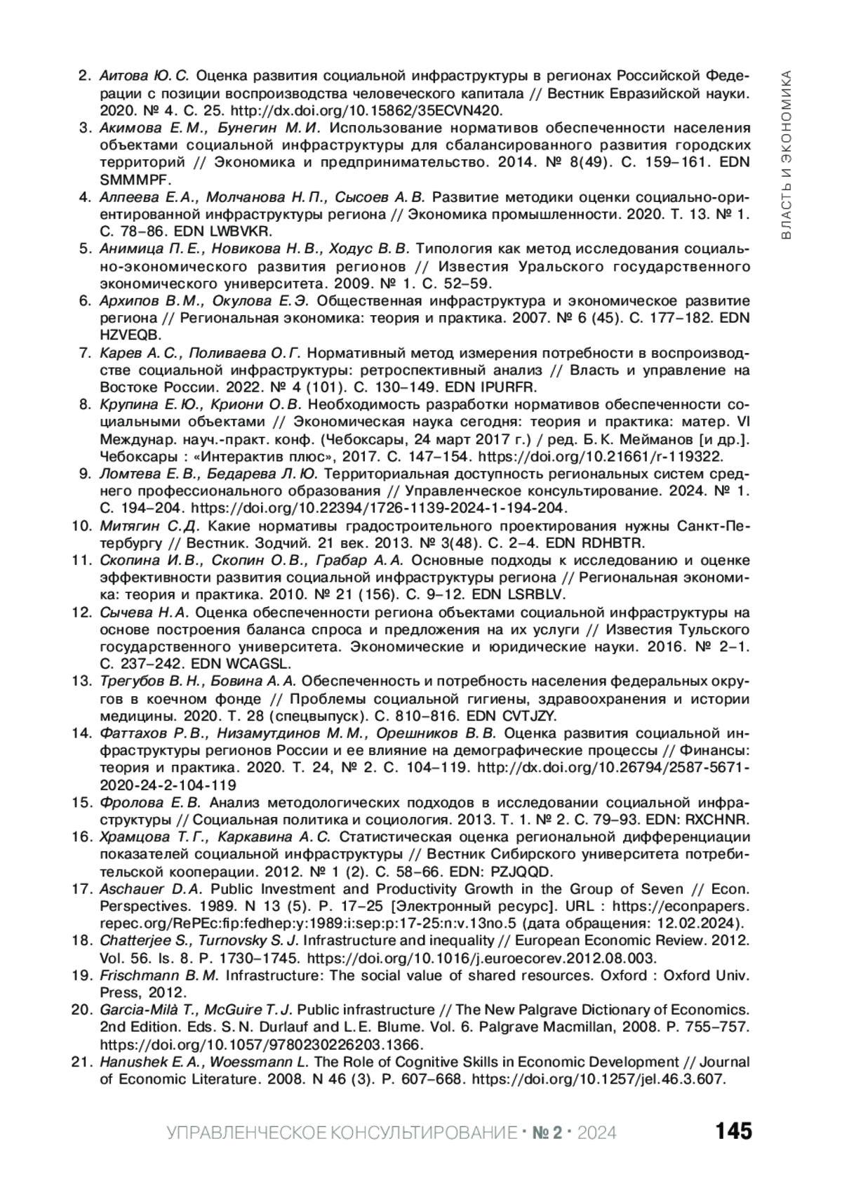 2. Аитова Ю. С. Оценка развития социальной инфраструктуры в регионах Российской Федерации с позиции воспроизводства человеческого капитала // Вестник Евразийской науки. 2020. № 4. С. 25. DOI: 10.15862/35ECVN420 EDN: GNXLHJ