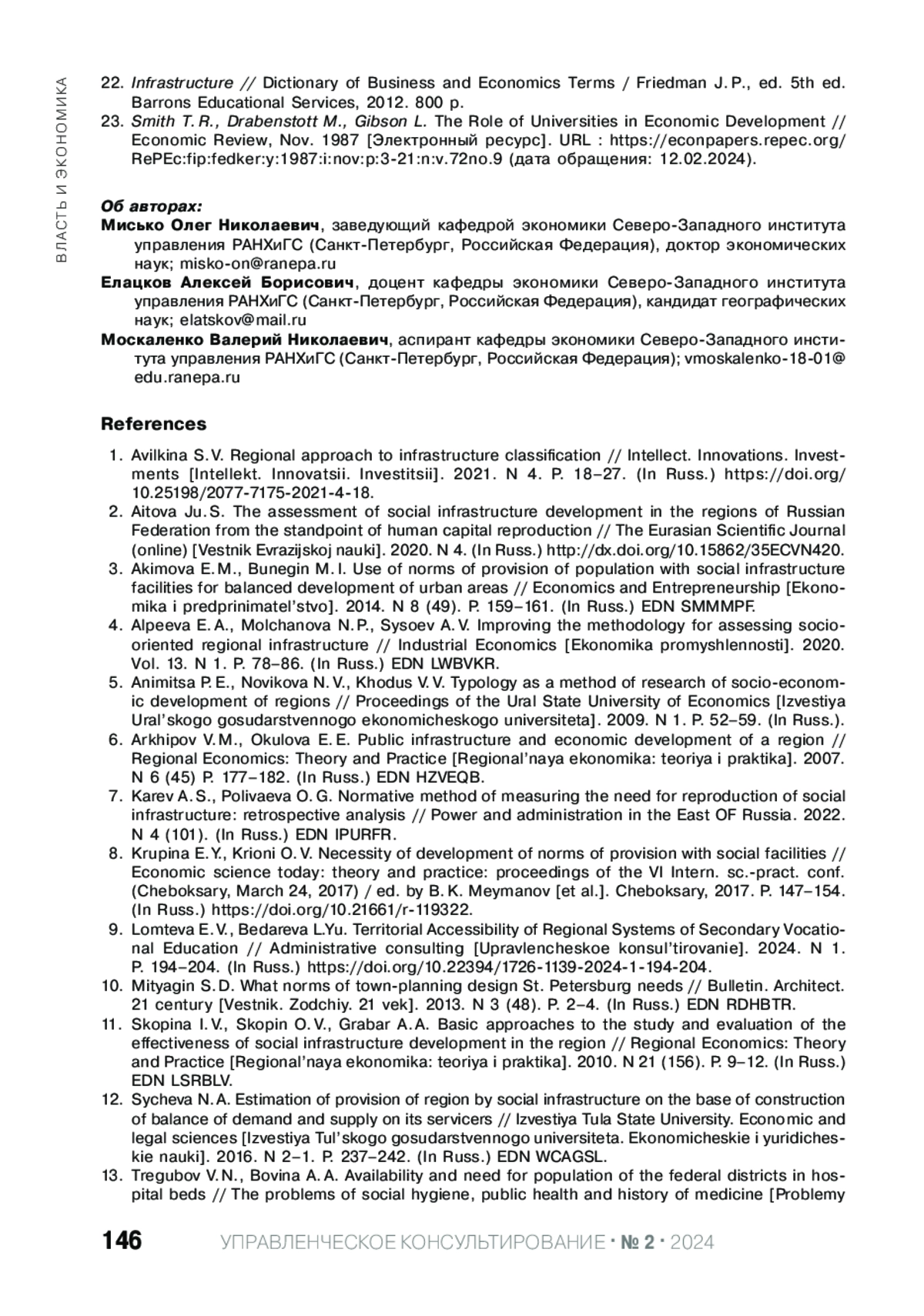 1. Авилкина С. В. Региональный подход к классификации инфраструктуры // Интеллект. Инновации. Инвестиции. 2021. № 4. С. 18-27. DOI: 10.25198/2077-7175-20214-18 EDN: UKOOTD