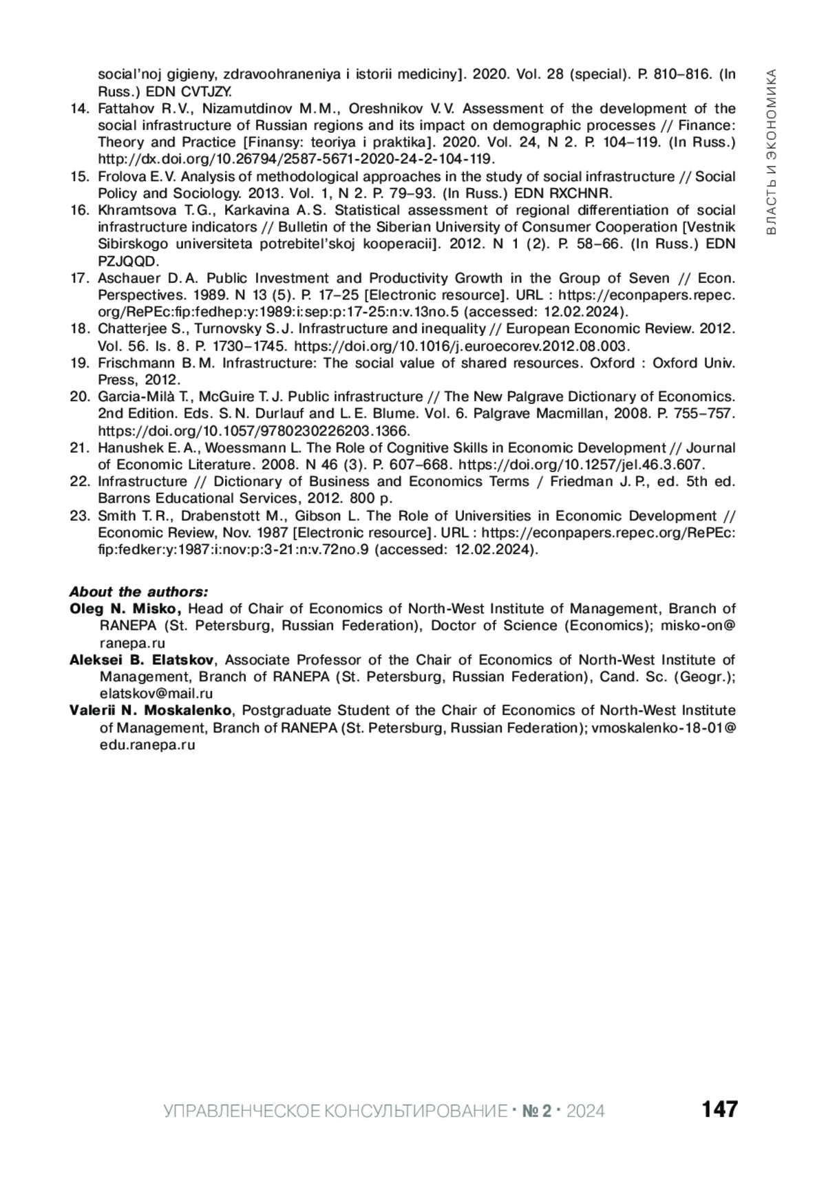 14. Фаттахов Р. В., Низамутдинов М. М., Орешников В. В. Оценка развития социальной инфраструктуры регионов России и ее влияние на демографические процессы // Финансы: теория и практика. 2020. Т. 24, № 2. С. 104-119. DOI: 10.26794/2587-56712020-24-2-104-119 EDN: UAFFGF