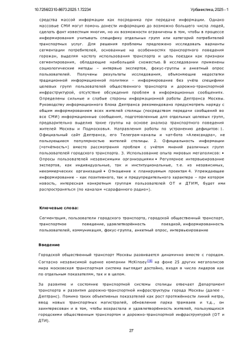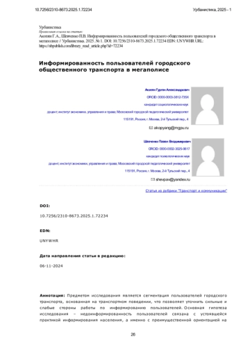 Предметом исследования является сегментация пользователей городского транспорта, основанная на транспортном поведении, что позволяет уточнить сильные и слабые стороны работы по информированию пользователей. Основная гипотеза исследования - недоинформированность пользователей связана с устоявшейся практикой информирования населения, а именно с преимущественной ориентацией на средства массой информации как посредника при передаче информации. Однако массовые СМИ могут помочь донести информацию до возможно большего числа людей, сделать факт известным многим, но их возможности ограничены в том, чтобы в процессе информирования учитывать специфику отдельных групп или категорий потребителей транспортных услуг. Для решения проблемы предложено исследовать варианты сегментации потребителей, основанные на особенностях транспортного поведения горожан, выделяя частоту использования транспорта и цель поездки как признаки сегментирования, обладающие наибольшей схожестью. В исследовании применены социологические методы - интервью экспертов, фокус-группы и анкетный опрос пользователей. Получены результаты исследования, объясняющие недостатки традиционной информационной политики - информирование без учёта специфики целевых групп пользователей общественного транспорта и дорожно-транспортной инфраструктурой, отсутствие обсуждения проблем в информационных сообщениях. Определены сильные и слабые стороны информационной работы Дептранса Москвы. Руководству информационного блока Дептранса рекомендовано предусмотреть наряду с общим информированием всех жителей столицы (посредством передачи сообщений во все СМИ) информационные сообщения, подготовленные для отдельных целевых групп, предварительно выделив такие группы на основе анализа транспортного поведения жителей Москвы и Подмосковья. Направления работы по устранению дефицитов: 1. Официальный сайт Дептранса, его Телеграм-каналы и чат-бота «Александра», не пользующиеся популярностью жителей столицы. 2. Официальность информации («отчётность») вместо рассмотрения проблем с учётом мнений различных групп пользователей городского транспорта. 3. Использование опыта мировых мегаполисов: •Опросы пользователей независимыми организациями •Регулярное интервьюирование экспертов, как индивидуальные, так и институциональные, т. е. из независимых, некоммерческих организаций •Отношение к планируемым проектам 4. Упреждающее информирование - как позитивного, так и предупредительного характера - при котором новость, интересная конкретным группам пользователей ОТ и ДТИМ, будет ими распространяться (по каналам «сарафанного радио»).