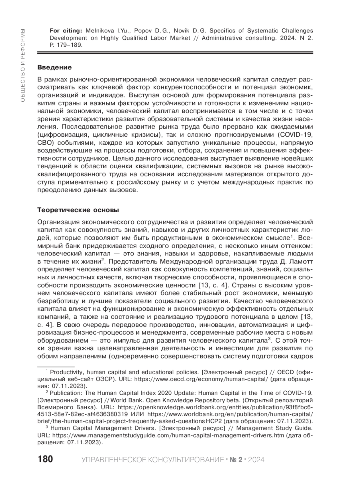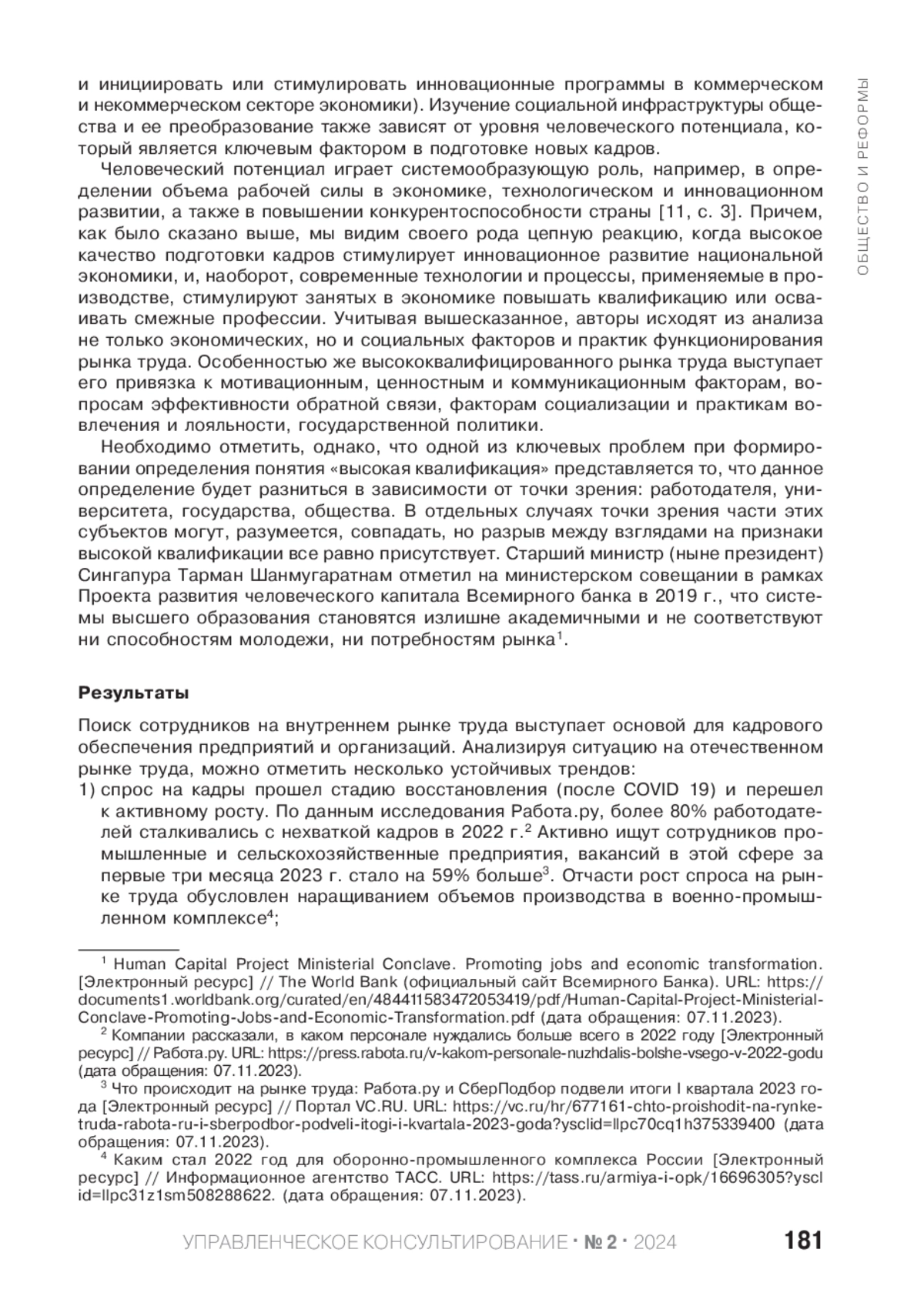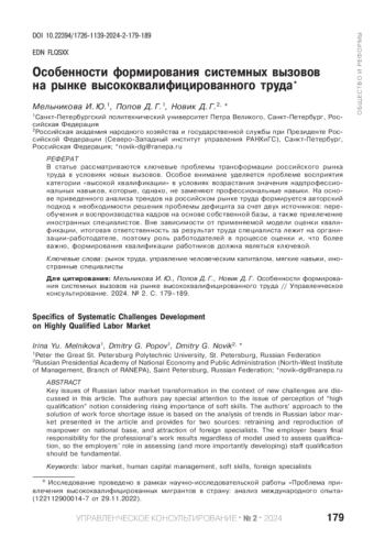 В рамках рыночно-ориентированной экономики человеческий капитал следует рассматривать как ключевой фактор конкурентоспособности и потенциал экономик, организаций и индивидов. Выступая основой для формирования потенциала развития страны и важным фактором устойчивости и готовности к изменениям национальной экономики, человеческий капитал воспринимается в том числе и с точки зрения характеристики развития образовательной системы и качества жизни населения. Последовательное развитие рынка труда было прервано как ожидаемыми (цифровизация, цикличные кризисы), так и сложно прогнозируемыми (COVID-19, СВО) событиями, каждое из которых запустило уникальные процессы, напрямую воздействующие на процессы подготовки, отбора, сохранения и повышения эффективности сотрудников. Целью данного исследования выступает выявление новейших тенденций в области оценки квалификации, системных вызовов на рынке высококвалифицированного труда на основании исследования материалов открытого доступа применительно к российскому рынку и с учетом международных практик по преодолению данных вызовов