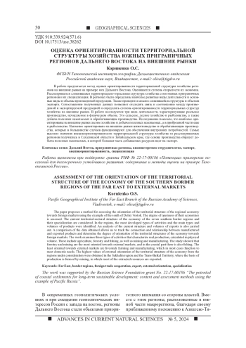 Статья: ОЦЕНКА ОРИЕНТИРОВАННОСТИ ТЕРРИТОРИАЛЬНОЙ СТРУКТУРЫ ХОЗЯЙСТВА ЮЖНЫХ ПРИГРАНИЧНЫХ РЕГИОНОВ ДАЛЬНЕГО ВОСТОКА НА ВНЕШНИЕ РЫНКИ (2024)
