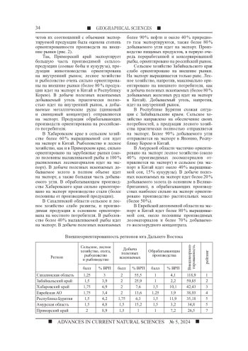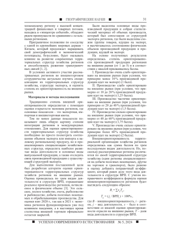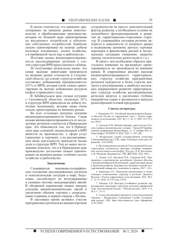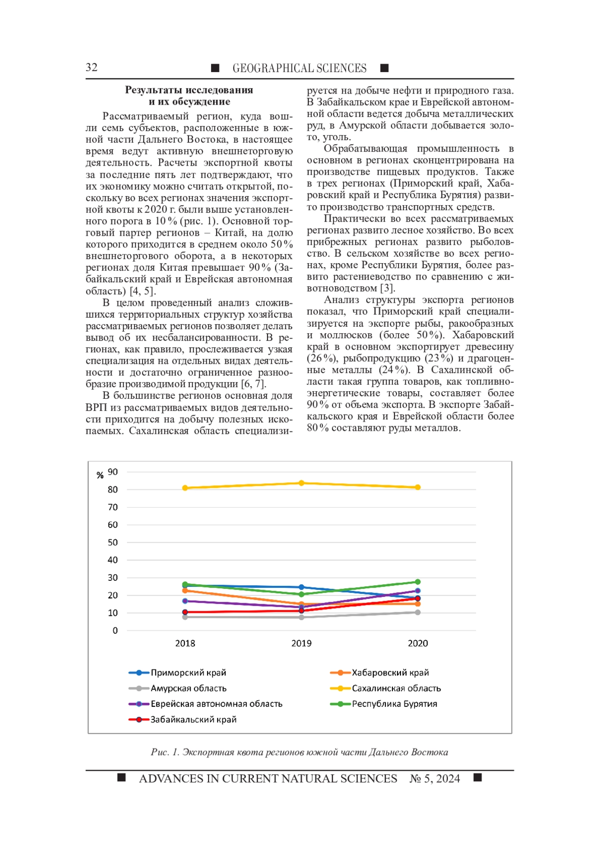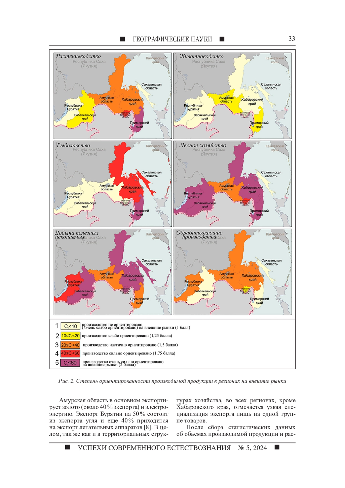 КОРНИЕНКО О. С. ОЦЕНКА ОРИЕНТИРОВАННОСТИ ТЕРРИТОРИАЛЬНОЙ СТРУКТУРЫ ХОЗЯЙСТВА ЮЖНЫХ ПРИГРАНИЧНЫХ РЕГИОНОВ ДАЛЬНЕГО ВОСТОКА НА ВНЕШНИЕ РЫНКИ // УСПЕХИ СОВРЕМЕННОГО ЕСТЕСТВОЗНАНИЯ. 2024. № 5