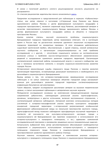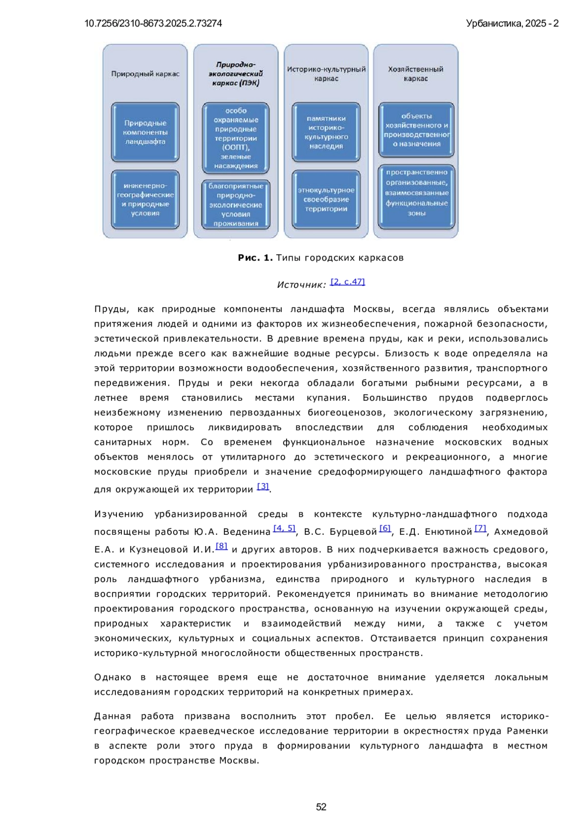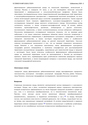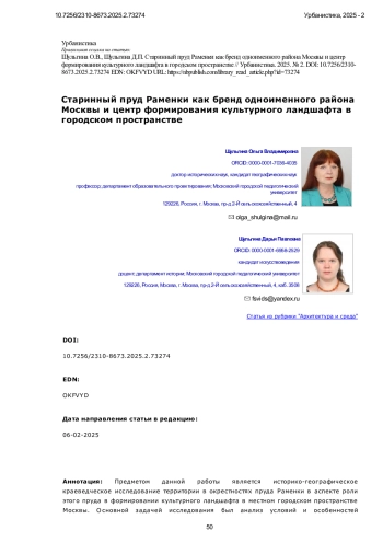Предметом данной работы является историко-географическое краеведческое исследование территории в окрестностях пруда Раменки в аспекте роли этого пруда в формировании культурного ландшафта в местном городском пространстве Москвы. Основной задачей исследования был анализ условий и особенностей формирования урбанизированной среды на локальной территории, включенной в границы Москвы в середине ХХ века, а до это являвшейся типичной сельской территорией с рекреационным и сельскохозяйственным профилем. Важно было проследить последовательные этапы градостроительной трансформации этой территории в высокоурбанизированное пространство с современной высотной застройкой, на всех этапах включающей старинный пруд в качестве ландшафтной доминанты. Также задачей исследования было показать эффективность культурно-ландшафтного подхода к исследованию городской среды крупного исторического города. Использованы метод системного анализа, а также историко-географический метод. В основу работы положены картографические, архивные, литературные и другие источники, воспоминания старожилов, а также систематизированы личные авторские наблюдения. Результаты проведенного исследования позволили показать, что на примере даже небольших и не самых известных природных объектов можно получить интересную и систематизированную информацию о формировании культурного ландшафта в местном городском пространстве, а также наглядно представить этапы и особенности формирования урбанизированной среды на данной локальной территории. Научная новизна исследования заключается в том, что на примере старинного московского пруда Раменки и его окружения прослежены этапы формирования культурного ландшафта данного микрорайона и выявлены специфичные для рассматриваемой территории ассоциативные ландшафты, характерные для окрестностей пруда в прошлом и настоящем. Были также отмечены особенности формирования урбанизированной среды на локальной территории после ее присоединения к Москве до настоящего времени. Кроме того, подтверждена идея устойчивости элементов природного каркаса городской территории, а также возрождения интереса и значимости пруда, как местной ключевой ландшафтной доминанты.