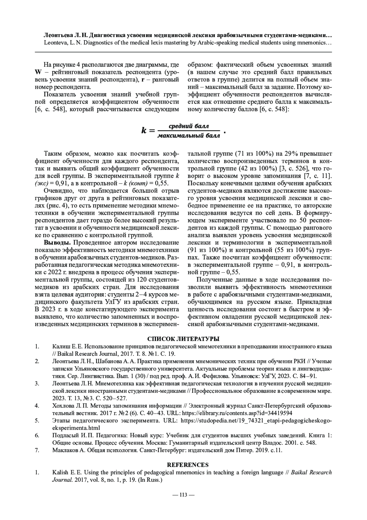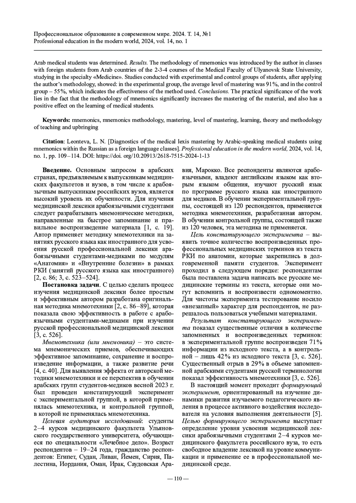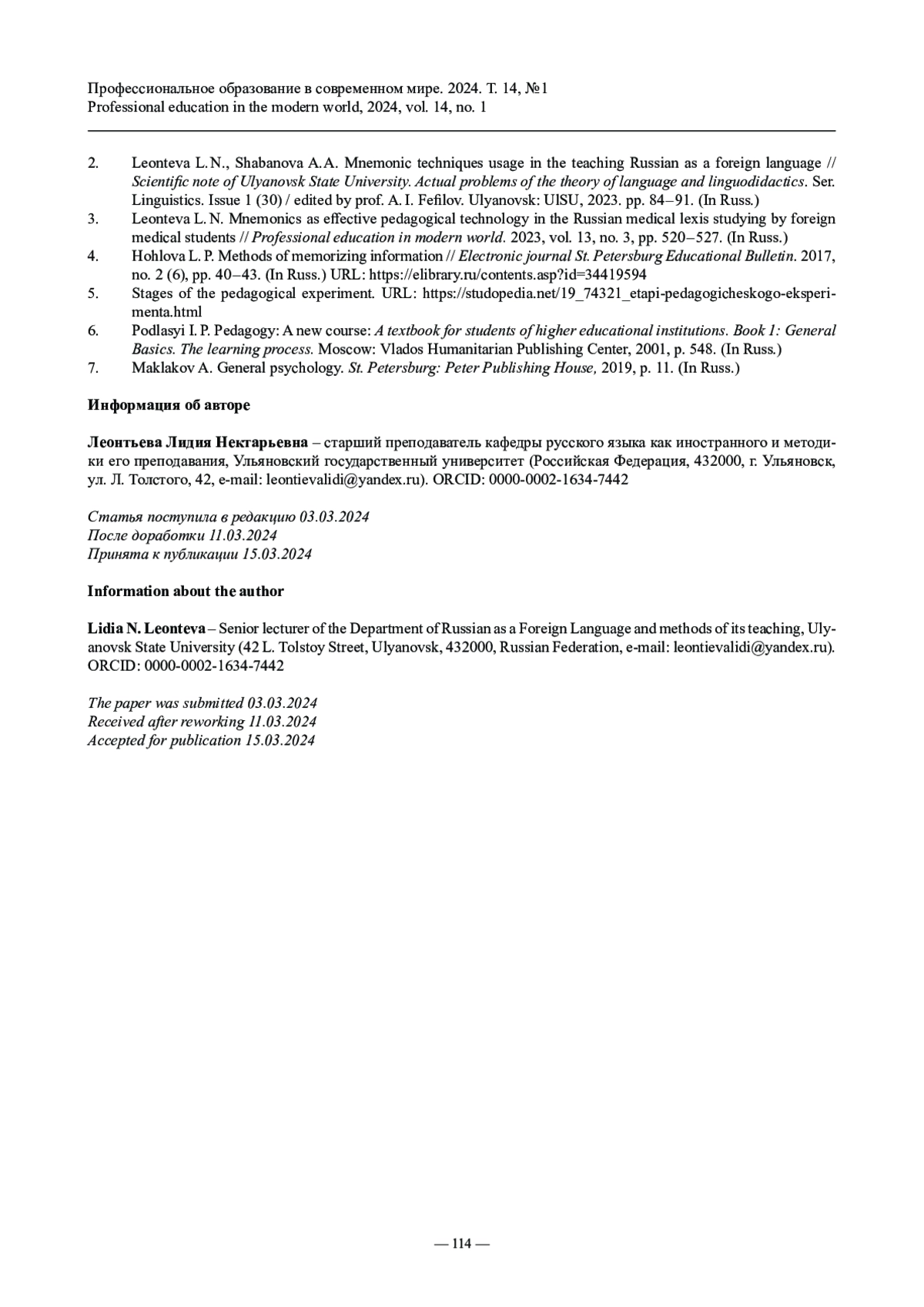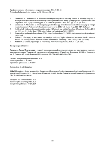 3. Леонтьева Л. Н. Мнемотехника как эффективная педагогическая технология в изучении русской медицинской лексики иностранными студентами-медиками // Профессиональное образование в современном мире. 2023. Т. 13, № 3. С. 520 - 527.