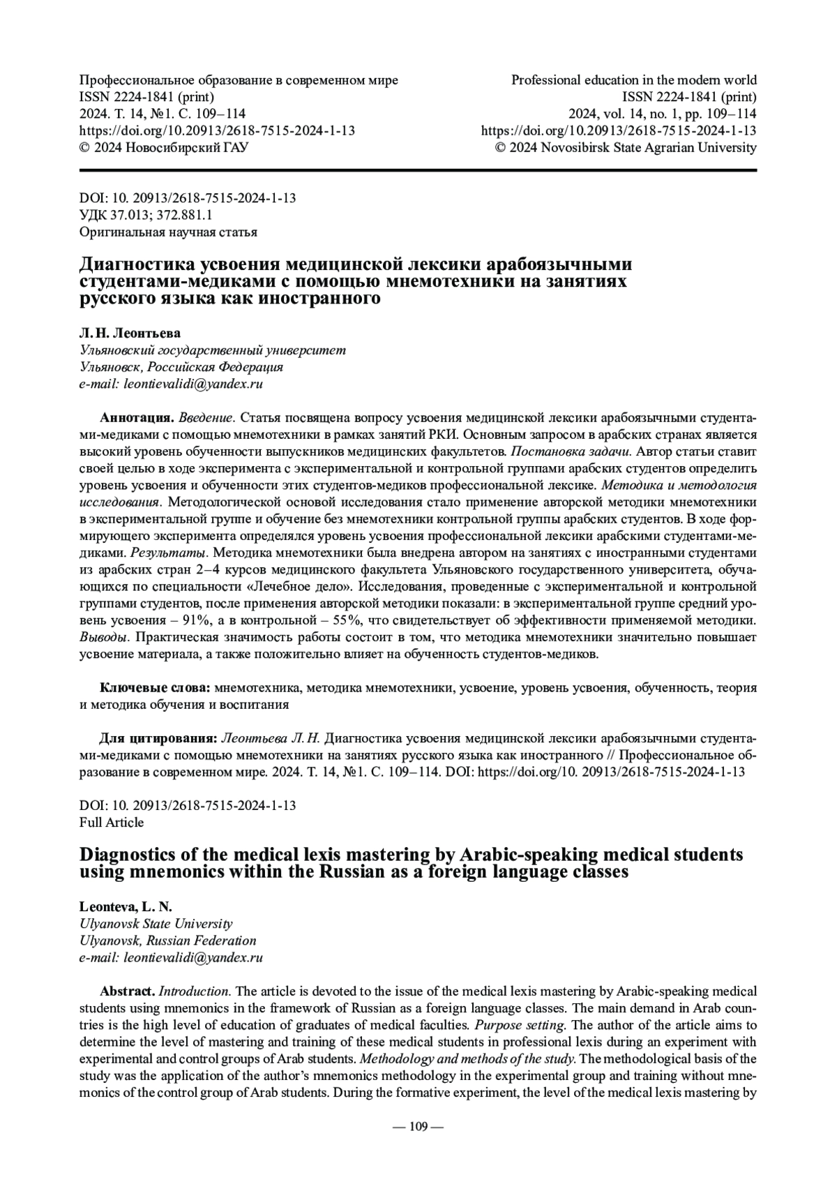 Введение. Статья посвящена вопросу усвоения медицинской лексики арабоязычными студентами-медиками с помощью мнемотехники в рамках занятий РКИ. Основным запросом в арабских странах является высокий уровень обученности выпускников медицинских факультетов.