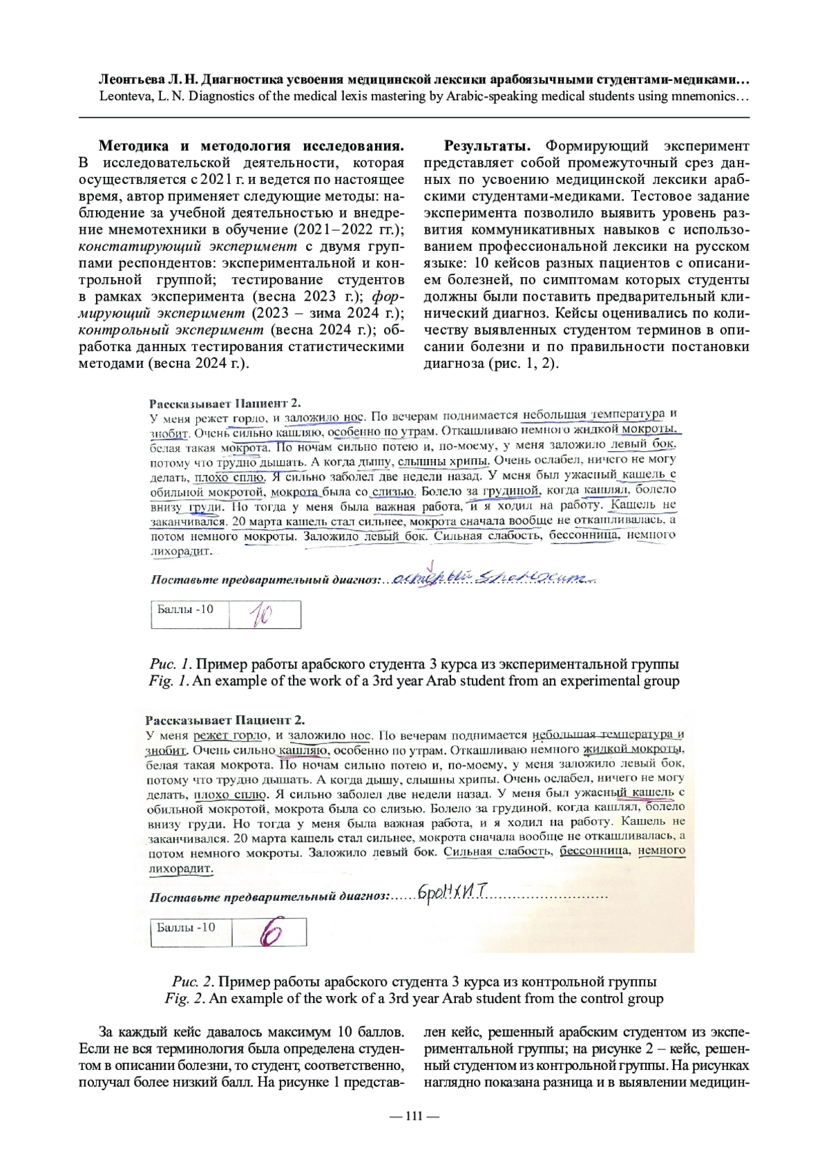 Методика и методология исследования. Методологической основой исследования стало применение авторской методики мнемотехники в экспериментальной группе и обучение без мнемотехники контрольной группы арабских студентов. В ходе формирующего эксперимента определялся уровень усвоения профессиональной лексики арабскими студентами-медиками.