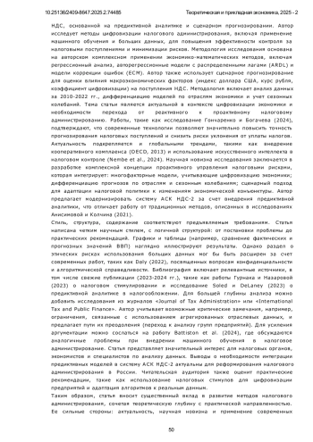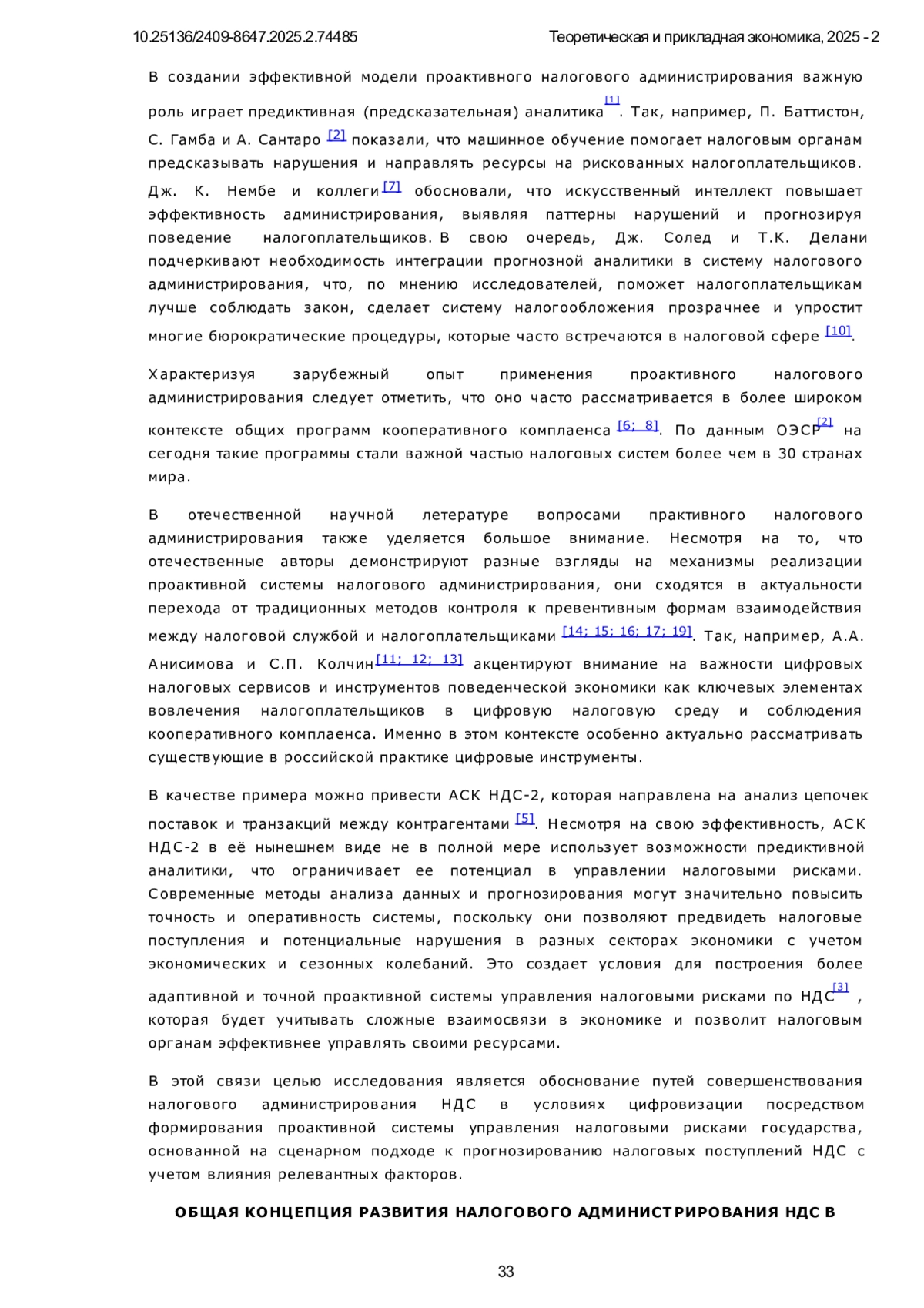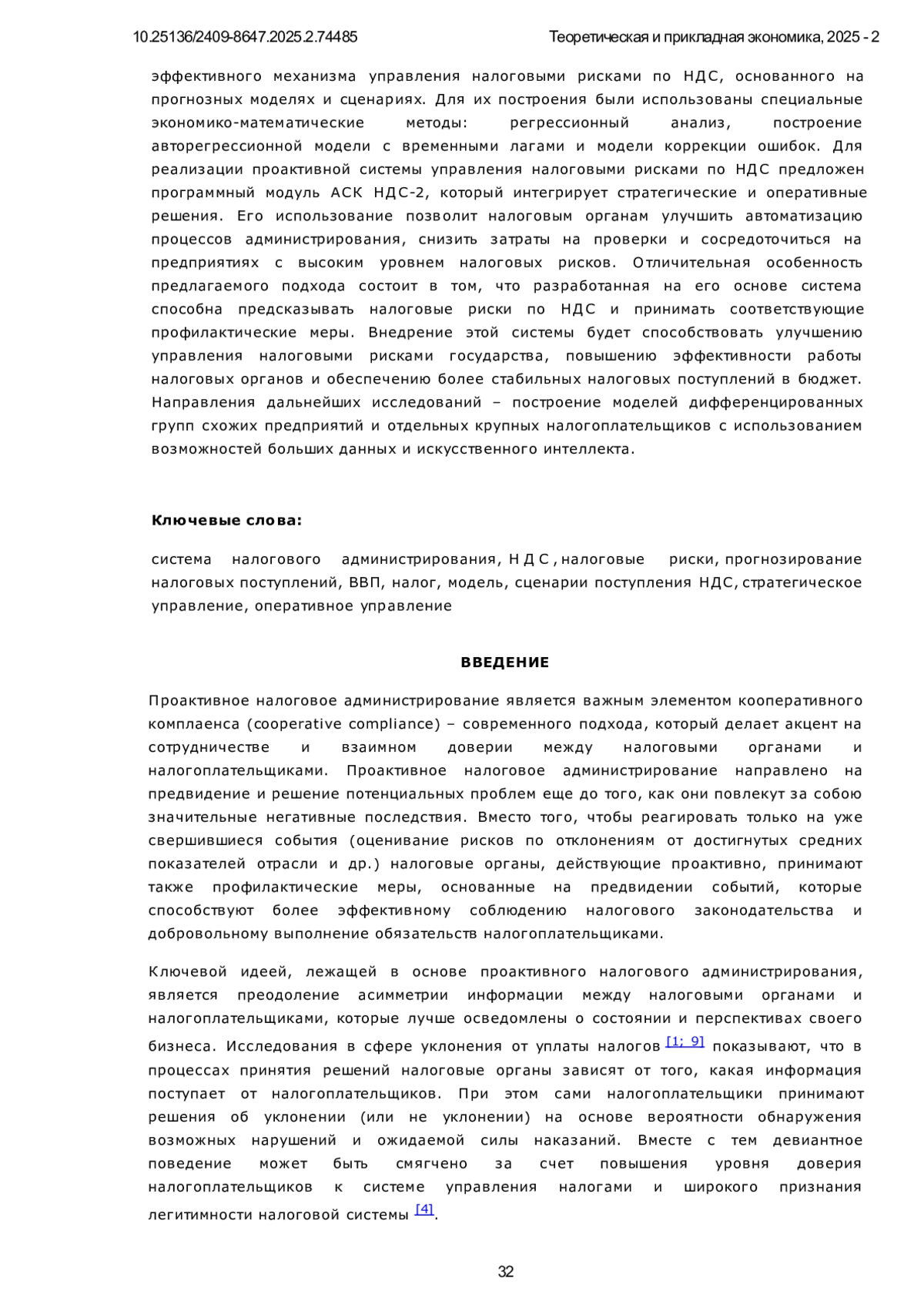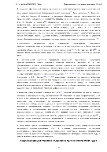 Актуальность исследования обусловлена важностью разработки и внедрения проактивных систем налогового администрирования, способных предсказывать и снижать налоговые риски для государства на основе реальных данных. Предмет исследования - система налогового администрирования НДС в Российской Федерации в условиях цифровизации и риски, связанные с ее функционированием. Целью работы является обоснование путей совершенствования налогового администрирования НДС в условиях цифровизации посредством формирования проактивной системы управления налоговыми рисками государства, основанной на применении сценарного подхода к прогнозированию налоговых поступлений с учетом влияния релевантных факторов. В статье обоснованы предложения по созданию более эффективного механизма управления налоговыми рисками по НДС, основанного на прогнозных моделях и сценариях. Для их построения были использованы специальные экономико-математические методы: регрессионный анализ, построение авторегрессионной модели с временными лагами и модели коррекции ошибок. Для реализации проактивной системы управления налоговыми рисками по НДС предложен программный модуль АСК НДС-2, который интегрирует стратегические и оперативные решения. Его использование позволит налоговым органам улучшить автоматизацию процессов администрирования, снизить затраты на проверки и сосредоточиться на предприятиях с высоким уровнем налоговых рисков. Отличительная особенность предлагаемого подхода состоит в том, что разработанная на его основе система способна предсказывать налоговые риски по НДС и принимать соответствующие профилактические меры. Внедрение этой системы будет способствовать улучшению управления налоговыми рисками государства, повышению эффективности работы налоговых органов и обеспечению более стабильных налоговых поступлений в бюджет. Направления дальнейших исследований - построение моделей дифференцированных групп схожих предприятий и отдельных крупных налогоплательщиков с использованием возможностей больших данных и искусственного интеллекта.