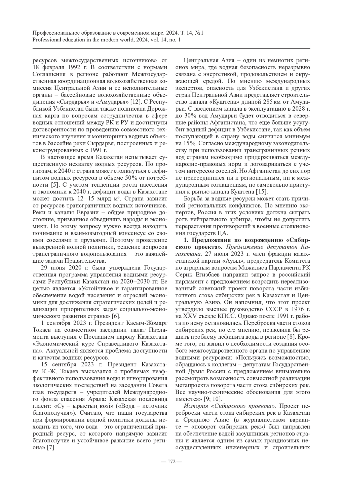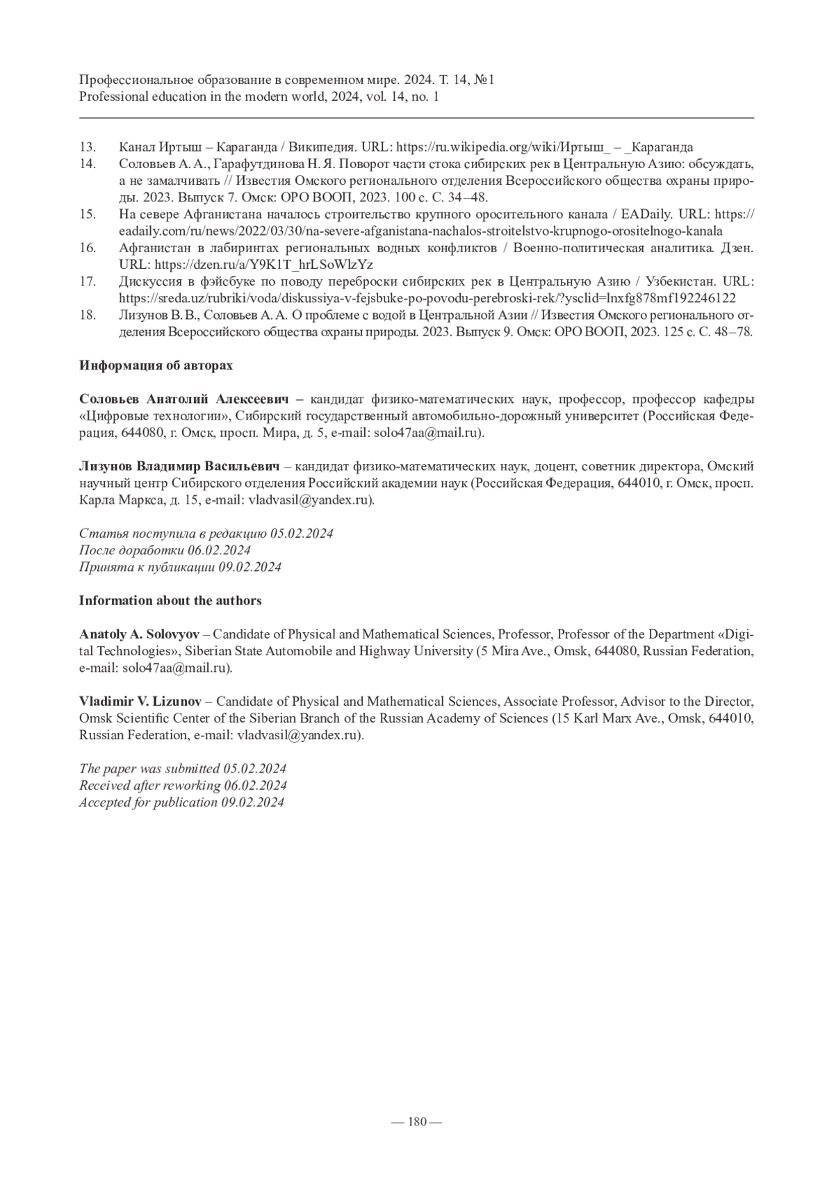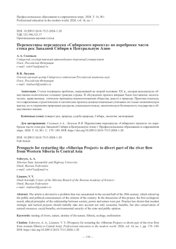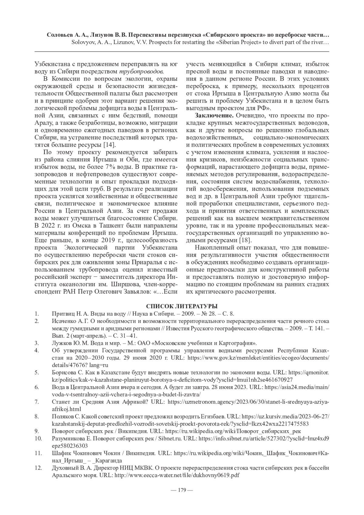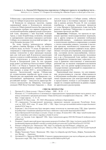 14. Соловьев А. А., Гарафутдинова Н. Я. Поворот части стока сибирских рек в Центральную Азию: обсуждать, а не замалчивать // Известия Омского регионального отделения Всероссийского общества охраны природы. 2023. Выпуск 7. Омск: ОРО ВООП, 2023. 100 с. С. 34 - 48.