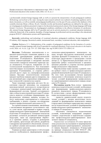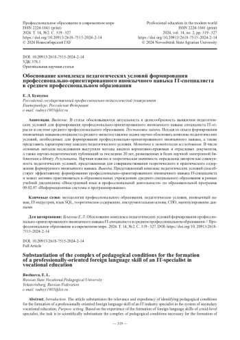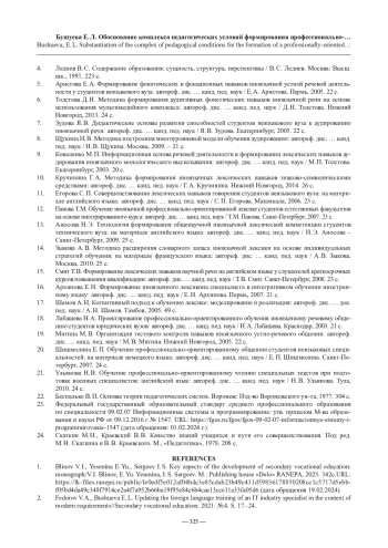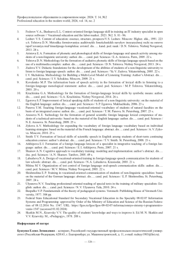 3. Федоров В. А., Бушуева Е. Л. Контекстно-ориентированный иноязычный навык в подготовке специалиста IT-отрасли в условиях СПО // Профессиональное образование и рынок труда. 2023. № 2. С. 81 - 96.