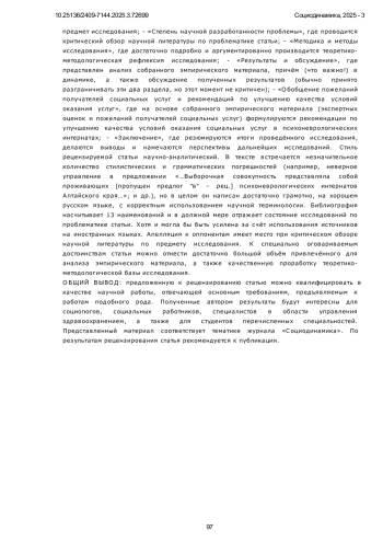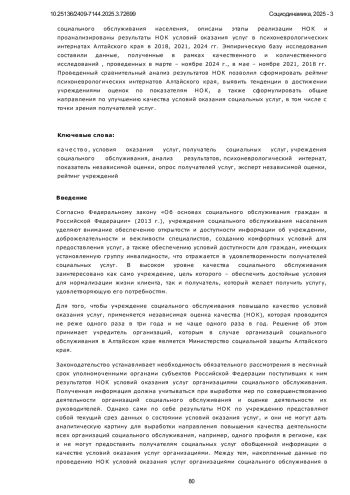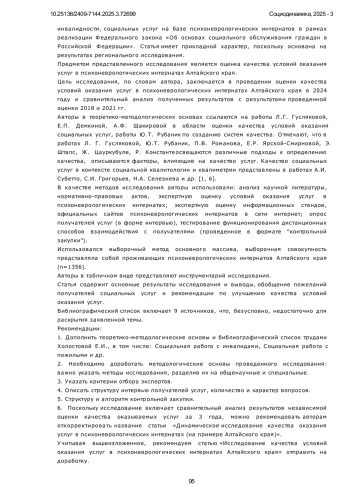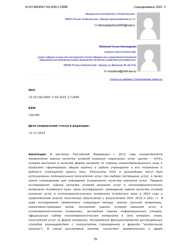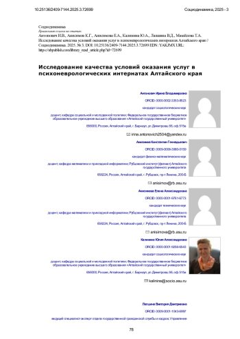 АНТОНОВИЧ И. В., АНИСИМОВ К. Г., АНИСИМОВА Е. А., КАЛИНИНА Ю. А., ЛАПШИНА В. Д., МАЗАЙЛОВА Т. А. ИССЛЕДОВАНИЕ КАЧЕСТВА УСЛОВИЙ ОКАЗАНИЯ УСЛУГ В ПСИХОНЕВРОЛОГИЧЕСКИХ ИНТЕРНАТАХ АЛТАЙСКОГО КРАЯ // СОЦИОДИНАМИКА. 2025. № 3