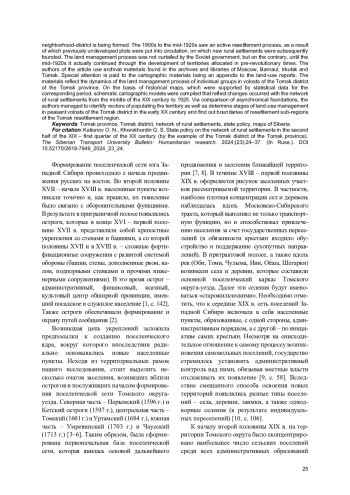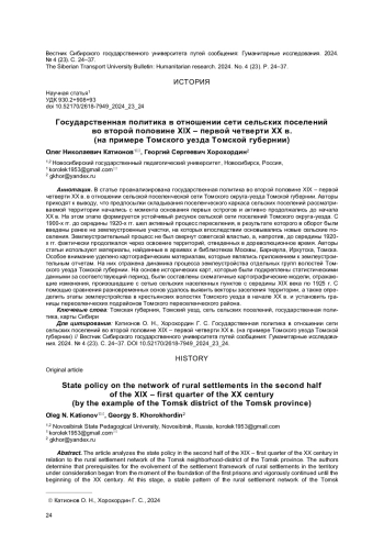 В статье проанализирована государственная политика во второй половине XIX - первой четверти XX в. в отношении сельской поселенческой сети Томского округа-уезда Томской губернии. Авторы приходят к выводу, что предпосылки складывания поселенческого каркаса сельских поселений рассматриваемой территории начались с момента основания первых острогов и активно продолжались до начала XX в. На этом этапе формируется устойчивый рисунок сельской сети поселений Томского округа-уезда. С 1900-х гг. до середины 1920-х гг. шел активный процесс переселения, в результате которого в оборот были введены ранее не землеустроенные участки, на которых впоследствии основывались новые сельские поселения. Землеустроительный процесс не был свернут советской властью, а, напротив, до середины 1920х гг. фактически продолжался через освоение территорий, отведенных в дореволюционное время. Авторы статьи используют материалы, найденные в архивах и библиотеках Москвы, Барнаула, Иркутска, Томска. Особое внимание уделено картографическим материалам, которые являлись приложением к землеустроительным отчетам. На них отражена динамика процесса землеустройства отдельных групп волостей Томского уезда Томской губернии. На основе исторических карт, которые были подкреплены статистическими данными за соответствующий период, были составлены схематичные картографические модели, отражающие изменения, произошедшие с сетью сельских населенных пунктов с середины XIX века по 1925 г. С помощью сравнения разновременных основ удалось выявить векторы заселения территории, а также определить этапы землеустройства в крестьянских волостях Томского уезда в начале XX в. и установить границы переселенческих подрайонов Томского переселенческого района.