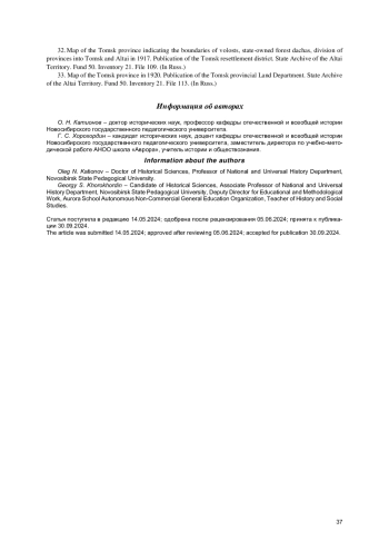 20. Лобанова А. А., Катионов О. Н. Учреждение и деятельность межевых служб в Западной Сибири в конце XVIII - начале XX в. Новосибирск: НГПУ, 2021. 163 с. EDN: EIXJEE