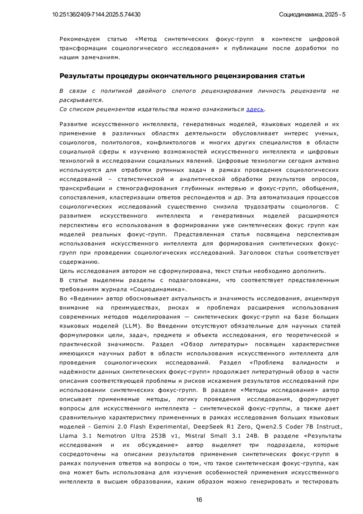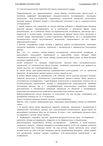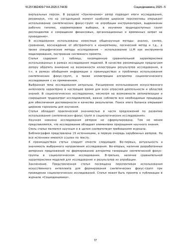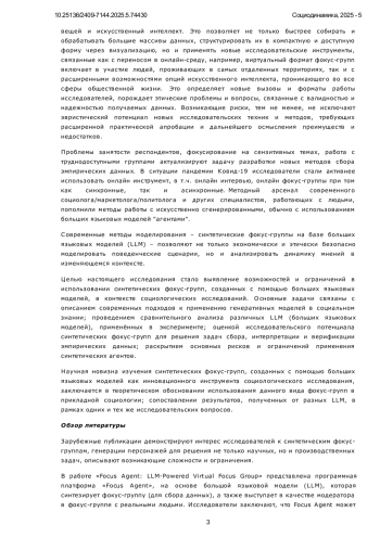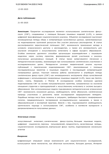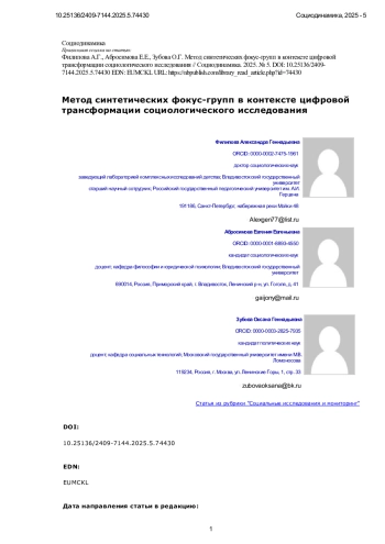 Предметом исследования является использование синтетических фокус-групп (СФГ), создаваемых с помощью больших языковых моделей (LLM), в рамках цифровой трансформации социологического анализа. Объектом исследования выступают инновационные методы сбора и интерпретации качественных данных, ориентированные на моделирование групповой дискуссии без участия реальных респондентов. В статье рассматривается эвристический потенциал СФГ, возможности применения метода в условиях ограниченного доступа к респондентам, а также его релевантность для изучения отношения к искусственному интеллекту в сфере высшего образования. Особое внимание уделяется способам организации взаимодействия с языковыми моделями через систему промптов, формированию ролей участников и анализу полученных дискурсивных позиций. В статье также затрагиваются этические и методологические вызовы, возникающие при использовании синтетических участников в исследовательских целях. Методология сочетает теоретический анализ научных публикаций с практическим моделированием СФГ, реализованным с помощью последовательных промптов к языковым моделям и последующей интерпретацией генерируемых данных. Научная новизна работы заключается в апробации метода синтетических фокус-групп (СФГ) как инновационного инструмента сбора качественной информации с использованием генеративных языковых моделей (LLM), таких как Gemini, Qwen, Llama, Deepseek, и Mistral. В исследовании особое внимание уделено моделированию СФГ на основе пользовательских промптов, направленных на изучение отношения студентов и преподавателей к искусственному интеллекту в системе высшего образования. Все использованные модели подчеркивали методологические ограничения СФГ: возможность искажения данных, необходимость четко обозначать синтетическую природу участников и дополнять такие исследования традиционными методами. Подобные методы могут быть полезны в ситуациях, требующих быстрого генерирования гипотез, предварительного тестирования исследовательских сценариев, а также в образовательной и экспертной практике. Вместе с тем, подчеркивается необходимость критического подхода к использованию СФГ, особенно в контексте валидности и репрезентативности получаемых данных.