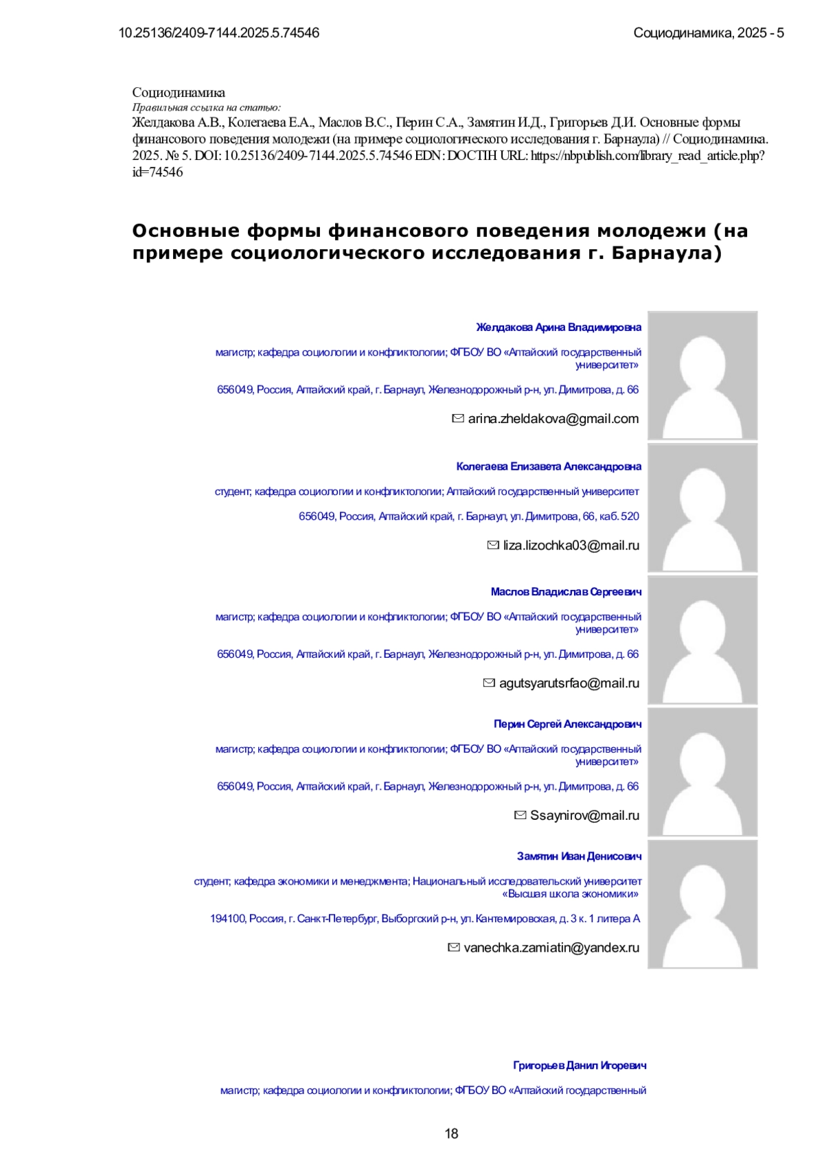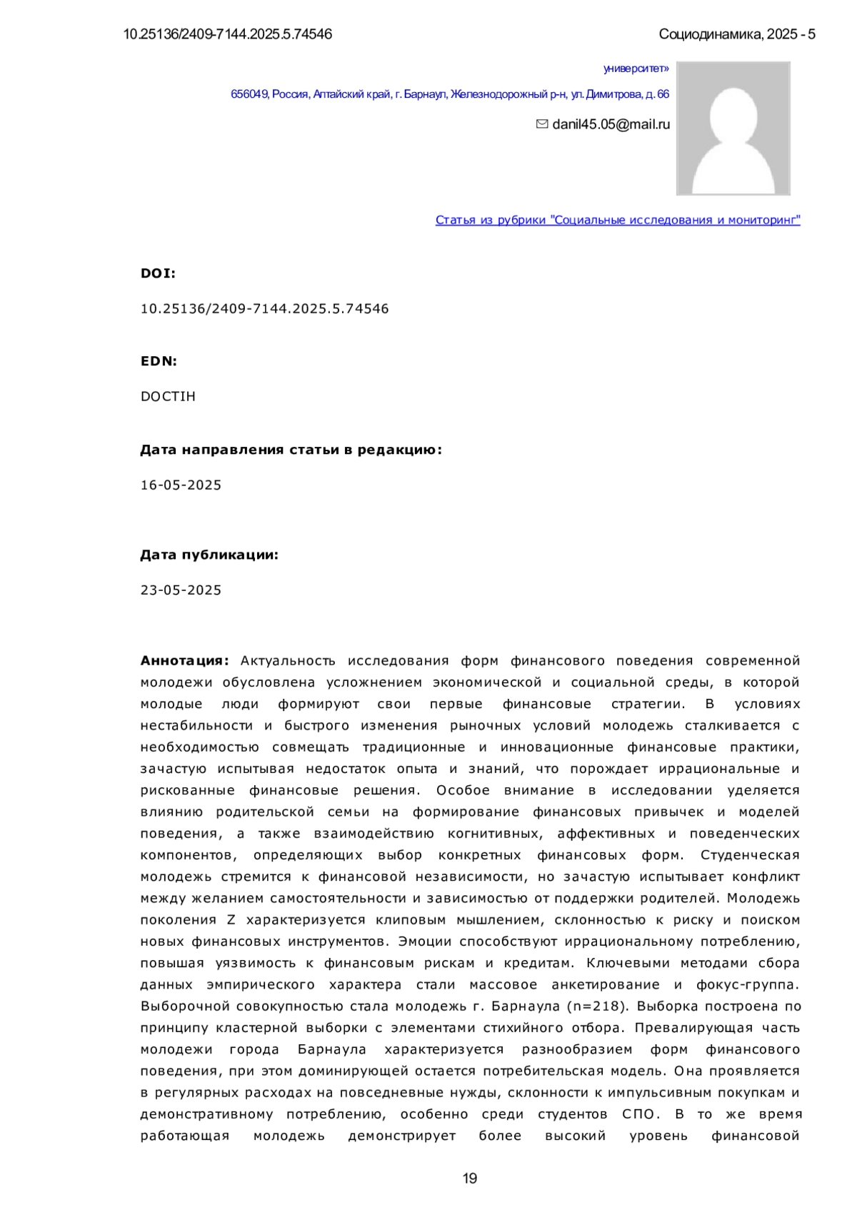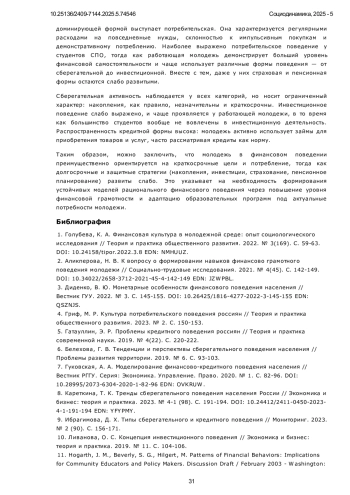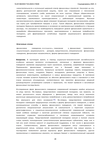 Актуальность исследования форм финансового поведения современной молодежи обусловлена усложнением экономической и социальной среды, в которой молодые люди формируют свои первые финансовые стратегии. В условиях нестабильности и быстрого изменения рыночных условий молодежь сталкивается с необходимостью совмещать традиционные и инновационные финансовые практики, зачастую испытывая недостаток опыта и знаний, что порождает иррациональные и рискованные финансовые решения. Особое внимание в исследовании уделяется влиянию родительской семьи на формирование финансовых привычек и моделей поведения, а также взаимодействию когнитивных, аффективных и поведенческих компонентов, определяющих выбор конкретных финансовых форм. Студенческая молодежь стремится к финансовой независимости, но зачастую испытывает конфликт между желанием самостоятельности и зависимостью от поддержки родителей. Молодежь поколения Z характеризуется клиповым мышлением, склонностью к риску и поиском новых финансовых инструментов. Эмоции способствуют иррациональному потреблению, повышая уязвимость к финансовым рискам и кредитам. Ключевыми методами сбора данных эмпирического характера стали массовое анкетирование и фокус-группа. Выборочной совокупностью стала молодежь г. Барнаула (n=218). Выборка построена по принципу кластерной выборки с элементами стихийного отбора. Превалирующая часть молодежи города Барнаула характеризуется разнообразием форм финансового поведения, при этом доминирующей остается потребительская модель. Она проявляется в регулярных расходах на повседневные нужды, склонности к импульсивным покупкам и демонстративному потреблению, особенно среди студентов СПО. В то же время работающая молодежь демонстрирует более высокий уровень финансовой самостоятельности и использует широкий спектр финансовых стратегий. Несмотря на это, формы долгосрочной финансовой защиты, такие как страхование и пенсионное планирование, остаются слабо развитыми во всех группах. Общая сберегательная активность присутствует, но носит ограниченный и краткосрочный характер, а инвестиции проявляются преимущественно у работающей молодежи. Высокая распространенность кредитных форм отражает тенденцию молодежи воспринимать займы как норму для приобретения товаров и услуг. Таким образом, финансовое поведение молодежи Барнаула ориентировано в основном на краткосрочные потребности и текущие расходы, что указывает на необходимость повышения уровня финансовой грамотности и разработки образовательных программ, адаптированных к реальным потребностям молодежи, для формирования устойчивых моделей рационального финансового поведения.
