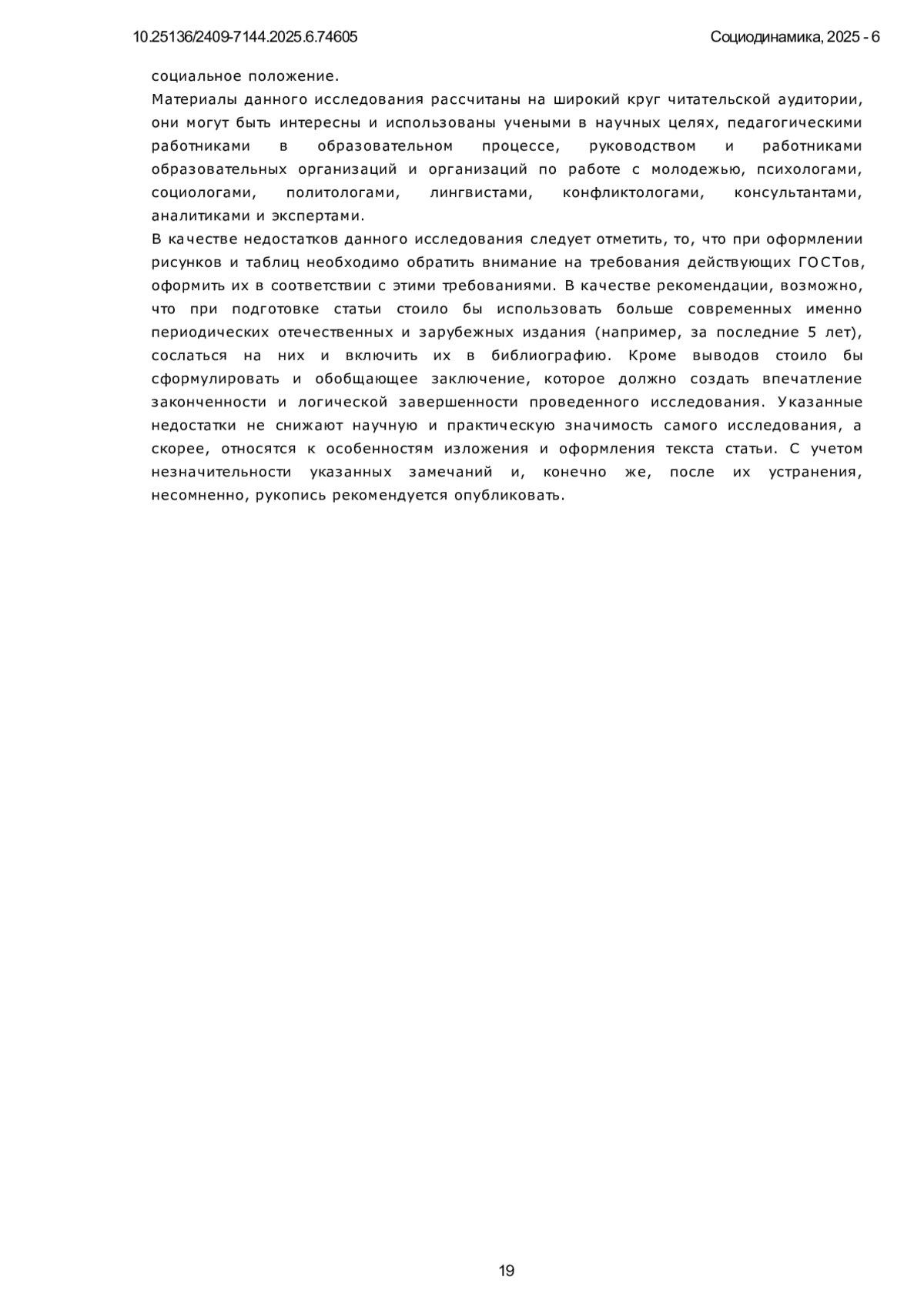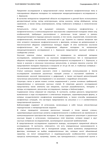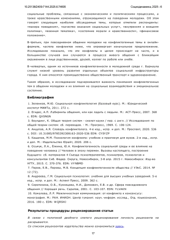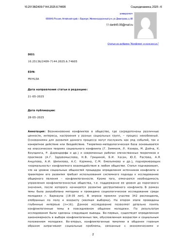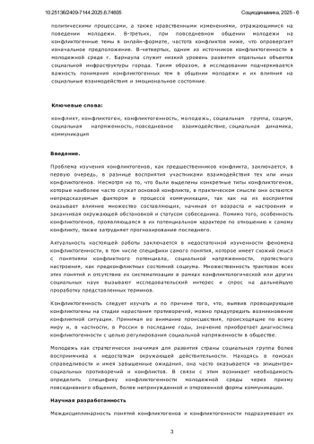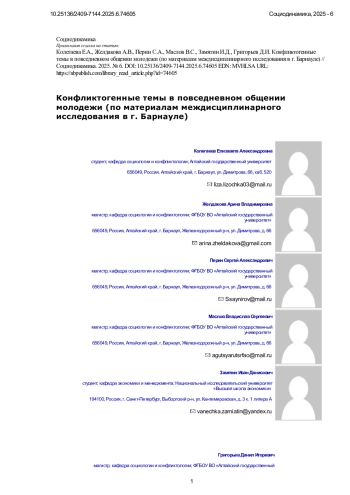 КОЛЕГАЕВА Е. А., ЖЕЛДАКОВА А. В., ПЕРИН С. А., МАСЛОВ В. С., ЗАМЯТИН И. Д., ГРИГОРЬЕВ Д. И. КОНФЛИКТОГЕННЫЕ ТЕМЫ В ПОВСЕДНЕВНОМ ОБЩЕНИИ МОЛОДЕЖИ (ПО МАТЕРИАЛАМ МЕЖДИСЦИПЛИНАРНОГО ИССЛЕДОВАНИЯ В Г. БАРНАУЛЕ) // СОЦИОДИНАМИКА. 2025. № 6