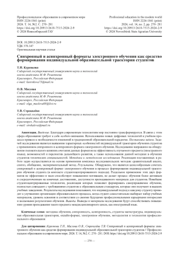 Результаты. Обнаружено, что является целесообразным сочетать синхронный и асинхронный формат электронного обучения в процессе формирования индивидуальной траектории обучения студента (в контексте студентоцентрированного подхода). Раздельное применение этих двух форматов не эффективно и мало способствует повышению мотивации, не делает процесс обучения более активным и сосредоточенным на конечных достижениях, доступности преподаваемого материала для студентов. Новейшие студентоцентрированные технологии, реализация которых позволяет формировать самоуправляемое обучение, полностью совпадают с требованиями студентов к образовательным стандартам, которые они получают в высших учебных заведениях. Результаты исследования показывают, что индивидуальный подход к каждому студенту приводит к улучшению организации образовательного процесса, когда студент самостоятельно выбирает набор учебных материалов, уровень освоения в соответствии со своими будущими профессиональными карьерными интересами и желаемыми результатами обучения.