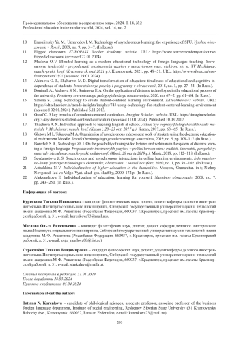 3. Kurenkova T. N., Maslova O. V., Savelyeva M. V., Strekaleva T. V. «Flipped class» as an individual approach technology in teaching English to IT Master degree students // Innovation management and information technology impact on global economy in the era of pandemic: proc. of the 37th Intern. Business Information Management Assoc. conf. (IBIMA) (Cordoba, 30 - 31 may 2021). Cordoba, 2021. P. 3877 - 3881.