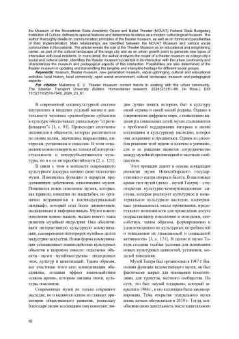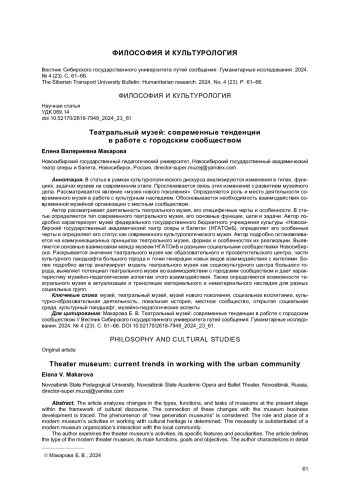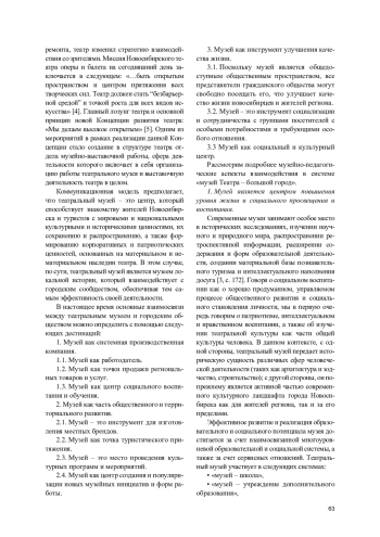 Автор рассматривает деятельность театрального музея, его специфичные черты и особенности. В статье определяется тип современного театрального музея, его основные функции, цели и задачи. Автор подробно характеризует музей федерального государственного бюджетного учреждения культуры «Новосибирский государственный академический театр оперы и балета» (НГАТОиБ), определяет его особенные черты и определяет его статус как современного культурологического музея. Автор подробно останавливается на коммуникационных принципах театрального музея, формах и особенностях их реализации. Выявляются основные взаимосвязи между музеем НГАТОиБ и разными социальными сообществами Новосибирска. Раскрывается значение театрального музея как образовательного и просветительского центра, части культурного ландшафта большого города и точки генерации новых видов взаимодействия с жителями. Более подробно автор анализирует модель театрального музея как социокультурного центра большого города, выявляет потенциал театрального музея во взаимодействии с городским сообществом и дает характеристику музейно-педагогическим аспектам этого взаимодействия. Также определяются возможности театрального музея в актуализации и трансляции материального и нематериального наследия для разных социальных групп.