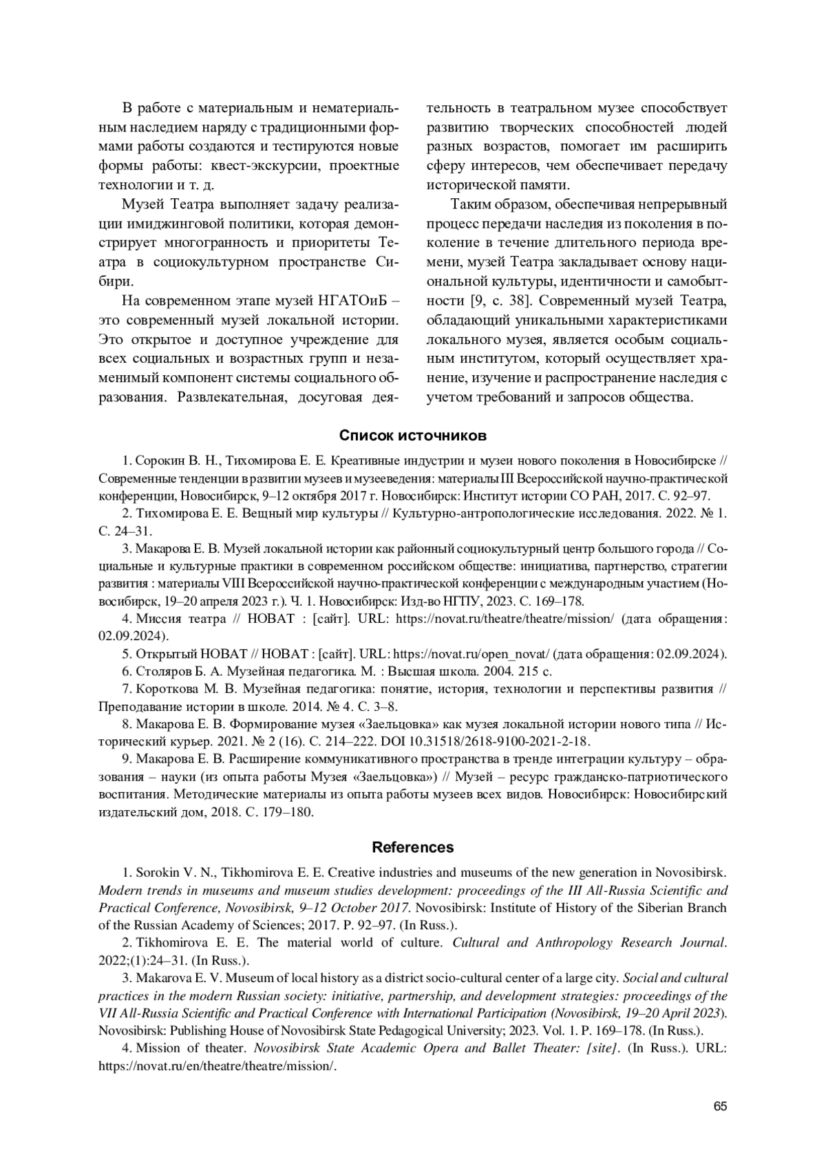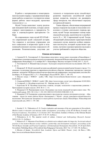 1. Сорокин В. Н., Тихомирова Е. Е. Креативные индустрии и музеи нового поколения в Новосибирске // Современные тенденции в развитии музеев и музееведения: материалы III Всероссийской научно-практической конференции, Новосибирск, 9-12 октября 2017 г. Новосибирск: Институт истории СО РАН, 2017. С. 92-97. EDN: ZXRUVD
