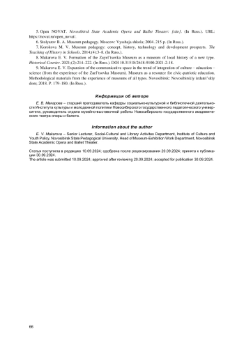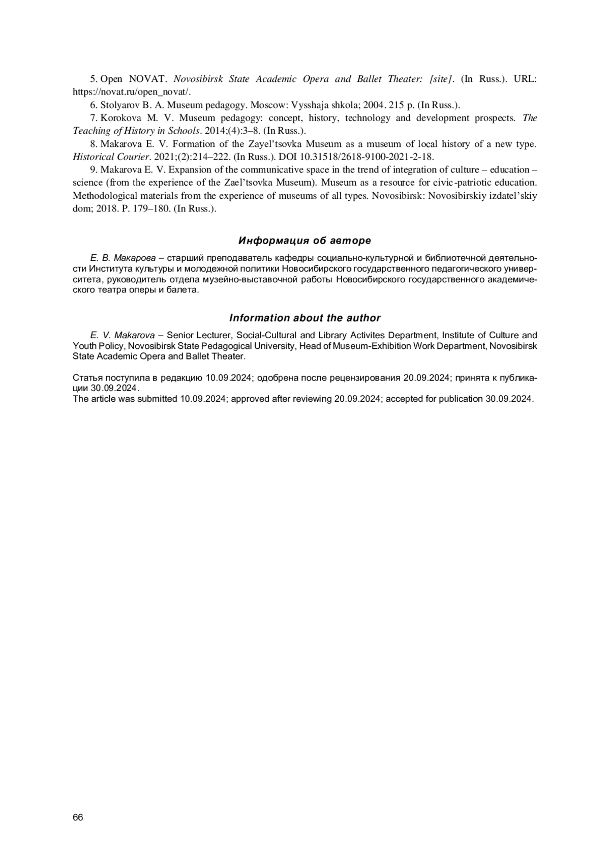 9. Макарова Е. В. Расширение коммуникативного пространства в тренде интеграции культуру - образования - науки (из опыта работы Музея “Заельцовка”) // Музей - ресурс гражданско-патриотического воспитания. Методические материалы из опыта работы музеев всех видов. Новосибирск: Новосибирский издательский дом, 2018. С. 179-180.