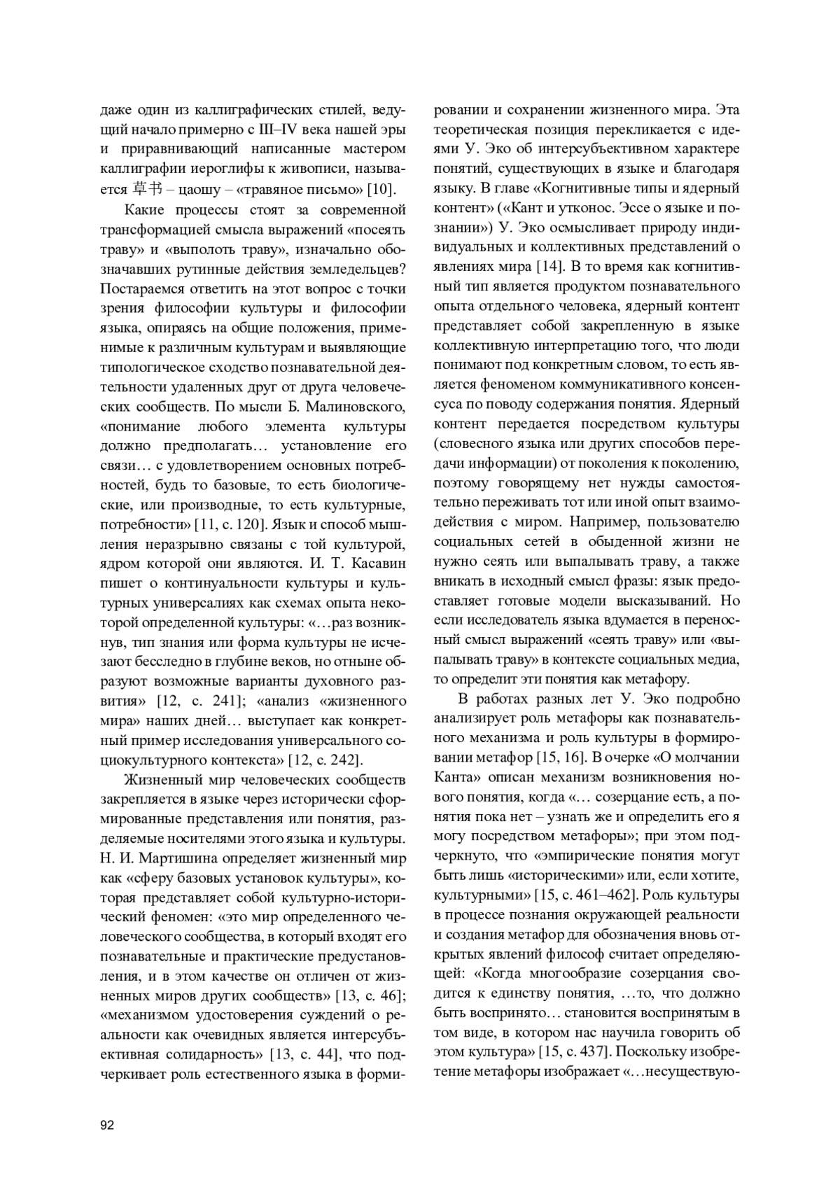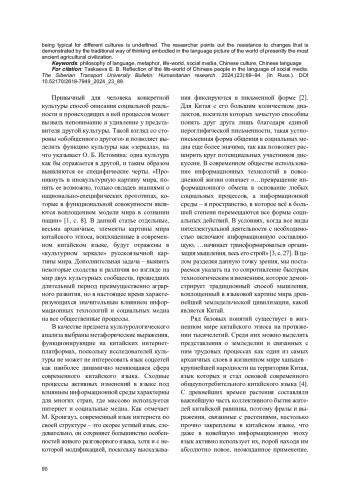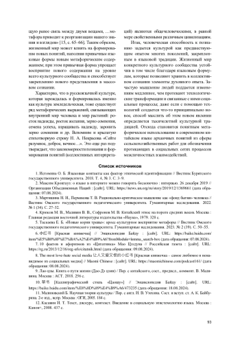 Наряду с отечественными и зарубежными научными и художественными публикациями, одним из важнейших источников информации и путем к пониманию языка и культуры современного Китая являются китайские социальные медиа. В статье описана «Красная книжечка» - одна из самых популярных китайских интернет-платформ, где пользователи делятся своими мнениями, используя характерную для социальных медиа письменную форму живого разговорного языка, при этом их высказывания несут в себе элементы как современной, так и традиционной культуры Китая. Смешение в живом языке современности и архаики как отражение жизненного мира китайского социума в XXI веке является предметом культур-философского анализа; эта особенность современного китайского языка и культуры рассмотрена на примере концепта «трава». Понятие «трава» издревле было одним из важнейших в жизненном мире китайского этноса, на протяжении тысяч лет развивавшегося преимущественно как аграрная цивилизация. С позиций философии языка и философии культуры рассмотрены связанные с этим понятием метафоры, описывающие поведение пользователей популярной китайской интернет-платформы, прослежена связь этих выражений с описанием традиционного способа ведения сельского хозяйства. Выявлено отражение традиционной культуры Китая в виртуальной среде социальных медиа благодаря устойчивости жизненного мира, которая сохраняется и во времена технологических революций. Дополнительно подчеркнута роль метафоры как универсального познавательного инструмента, присущего различным культурам. Вместе с тем автор отмечает сопротивление быстрым технологическим изменениям, которое демонстрирует традиционный способ мышления, воплощенный в языковой картине мира древнейшей из ныне существующих цивилизаций.