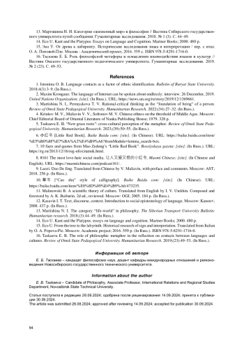 16. Таскаева Е. Б. Роль философской метафоры в осмыслении взаимодействия языков и культур // Вестник Омского государственного педагогического университета. Гуманитарные исследования. 2019. № 2 (23). С. 49-53. EDN: SSWMJX