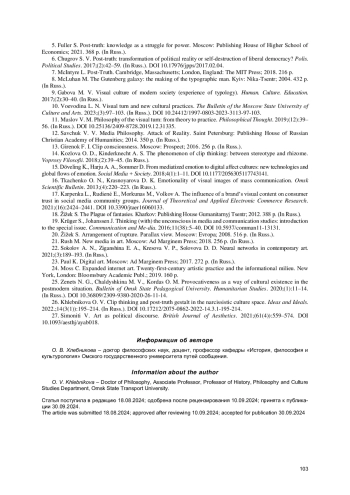 10. Воеводина Л. Н. Визуальный поворот и новые культурные практики // Вестник Московского государственного университета культуры и искусств. 2023. № 3. С. 97-103. DOI: 10.24412/1997-0803-2023-3113-97-103 EDN: WAXJHC