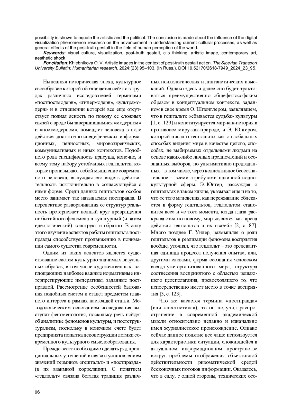 Статья посвящена рассмотрению особенностей бытования современных систем культурно значимых визуальных образов, в том числе художественных, воплощающих наиболее важные нормативные интерпретирующие императивы, заданные гештальтом постправды. Методологическим основанием исследования выступают феноменология и постструктурализм. В статье рассмотрены факторы существования актуальной визуальной культуры, обращено внимание на последствия иконического поворота в академическом интеллектуализме, акцентируется массовая трансформация понятийного мышления в клиповое. Также в статье анализируется общая логика существования медиасферы, рефлексируется ее выстроенность вокруг сверхзадачи манипулирования общественным сознанием через выстраивание перед потребителями информационного контента таких визуальных рядов, которые, вызывая у людей определенный эмоциональный отклик, заставляли бы их поступать нужным образом. Отмечается уникальность культурного контекста, в котором в наши дни существует искусство в целом, указываются специфические черты современных визуальных художественных образов, раскрывается технологический аспект их существования. Демонстрируется предопределенность эстетического шока в качестве единственной формы воплощения подлинно художественного содержания, выступающей как маркером глобальной культурной провокативности, так и одним из определяющих механизмов конструирования новых общественно значимых смыслов. Раскрывается роль условного современного художника как человека, который всегда включен в игру символических демонстраций, благодаря которым актуализируются псевдобытийные смыслы постправды. Показывается возможность отождествления художественного и политического. Делается вывод о влиянии исследования феномена цифровой визуализации на продвижение в понимании действующих культурных процессов, а также общих эффектов гештальта постправды в области восприятия мира человеком.