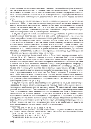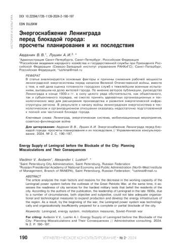 В статье анализируются основные факторы и причины снижения рабочей мощности ленинградской энергосистемы перед началом Великой Отечественной войны, вместе с тем, в ней дана оценка готовности городских служб к тяжелейшим военным испытаниям, выпавшим на долю жителей города. По мнению авторов публикации, руководство Ленинграда в конце 1930-х гг. в силу целого ряда обстоятельств, как объективного, так и субъективного порядка, не смогло принять адекватных организационных и технологических мер для расширения производства и развития энергетической инфраструктуры региона. В результате к началу войны ленинградская энергосистема в технологическом и организационном отношении оказалась недостаточно подготовленной к полной или частичной блокаде города.