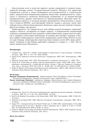 1. Груздев В. Б., Ежов В. А. Подвиг ленинградских энергетиков в годы блокады // Вопросы истории. 1985. № 4. С. 101-107. EDN: JVTDQL