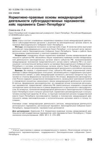 Цель статьи состоит в выявлении нормативно-правовых основ международной деятельности субгосударственных регионов с акцентом на законодательных органах власти на примере Законодательного Собрания Санкт-Петербурга. Методы: исследование построено на методе кейс-стади. В качестве кейса выступает российский город федерального значения Санкт-Петербург и его высший орган законодательной власти Законодательное Собрание Санкт-Петербурга. Также в работе были использованы сравнительный и политико-правовой подходы. Результаты: определены общие нормативно-правовые основы международной деятельности субъектов РФ; обозначены общие нормативно-правовые основы международной деятельности законодательных органов власти субъектов РФ; проанализированы международные полномочия представительного органа власти субъекта РФ и их соотношение с исполнительной ветвью власти на примере Законодательного Собрания Санкт-Петербурга и системы исполнительных органов власти Санкт-Петербурга; обозначены проблемы правового регулирования международной деятельности российских регионов. Выводы. Во-первых, с нормативной точки, субъекты РФ имеют ограниченный спектр свободы в сфере международных отношений, заключающийся в поддержании культурно-экономических связей, а сама международная активность регионов находится под контролем со стороны федеральных органов власти. Во-вторых, федеральное законодательство России содержит юридические неопределенности, касающиеся трактования понятий и определения конкретных механизмов и форм международной деятельности регионов. В-третьих, федеральное законодательство, не определяя четкие полномочия региональных парламентов, предоставляет субъектам РФ самостоятельно определять конкретные полномочия своих органов власти в рамках федерального и регионального законодательства. В-четвертых, полномочия международной деятельности Законодательного Собрания Санкт-Петербурга носят статусно-ценностный, нормативно-рекомендательный и консультативно-экспертный характер. В-пятых, в структуре полномочий органов государственной власти Санкт-Петербурга прослеживается перевес в полномочиях международной деятельности между законодательными и исполнительными органами власти в пользу последних.