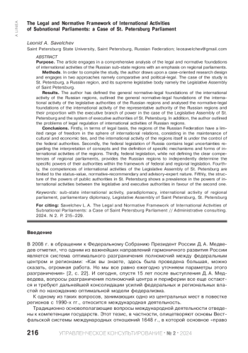 Purpose. The article engages in a comprehensive analysis of the legal and normative foundations of international activities of the Russian sub-state regions with an emphasis on regional parliaments. Methods. In order to compile the study, the author draws upon a case-oriented research design and engages in two approaches namely comparative and political-legal. The case of the study is St. Petersburg, a Russian region, and its supreme legislative body namely the Legislative Assembly of Saint Petersburg. Results. The author has defined the general normative-legal foundations of the international activity of the Russian regions, outlined the general normative-legal foundations of the international activity of the legislative authorities of the Russian regions and analysed the normative-legal foundations of the international activity of the representative authority of the Russian regions and their proportion with the executive branch of power in the case of the Legislative Assembly of St. Petersburg and the system of executive authorities of St. Petersburg. In addition, the author outlined the problems of legal regulation of international activities of Russian regions. Conclusions. Firstly, in terms of legal basis, the regions of the Russian Federation have a limited range of freedom in the sphere of international relations, consisting in the maintenance of cultural and economic ties, and the international activity of the regions itself is under the control of the federal authorities. Secondly, the federal legislation of Russia contains legal uncertainties regarding the interpretation of concepts and the definition of specific mechanisms and forms of international activities of the regions. Thirdly, federal legislation, while not defining the clear competences of regional parliaments, provides the Russian regions to independently determine the specific powers of their authorities within the framework of federal and regional legislation. Fourthly, the competences of international activities of the Legislative Assembly of St. Petersburg are limited to the status-value, normative-recommendary and advisory-expert nature. Fifthly, the structure of the powers of public authorities in St. Petersburg shows a prevalence in the powers of international activities between the legislative and executive authorities in favour of the second one